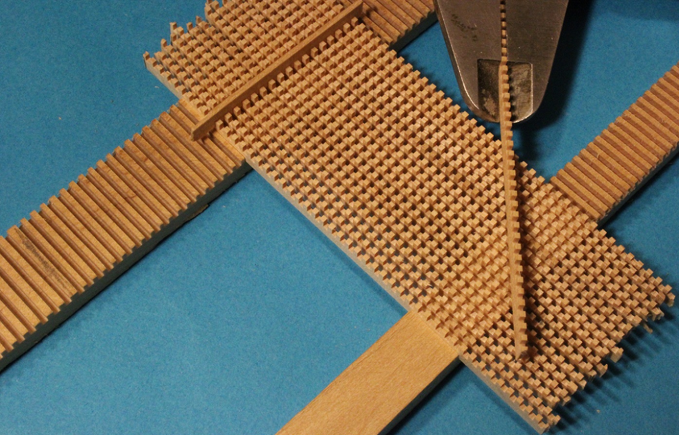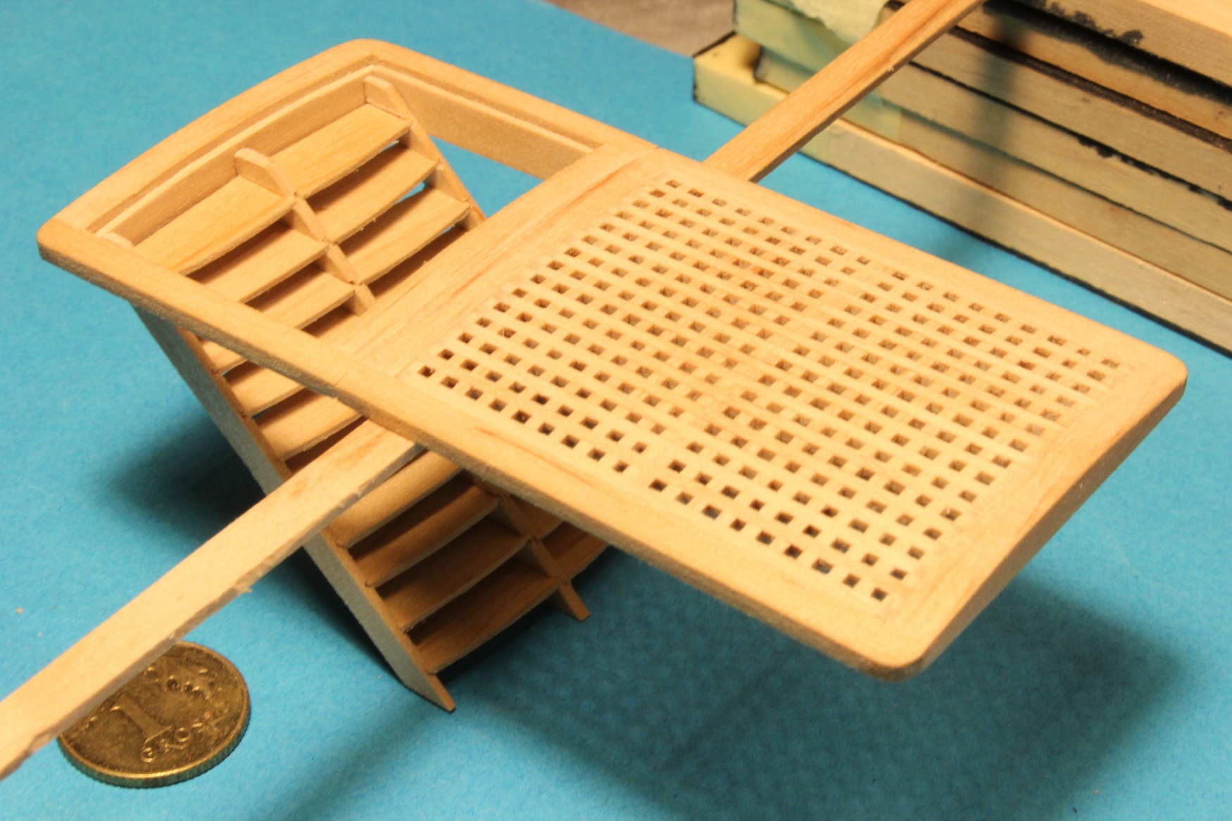 Wydziergałem surowe kawałki gretingu. Zostaje je jeszcze lekko wyoblić no i poprzycinać na wymiar. Na tę chwilę leżą pokład wyżej nad ich miejscem docelowym. Dalszy proces robienia gretingów polegał na dociskaniu "deską" w "deskę". Dawało mi ta w miarę równe osadzanie listew wzdłużnych. Najgorzej było z nanoszeniem kleju. To jet gorsze niż kołkowanie;)