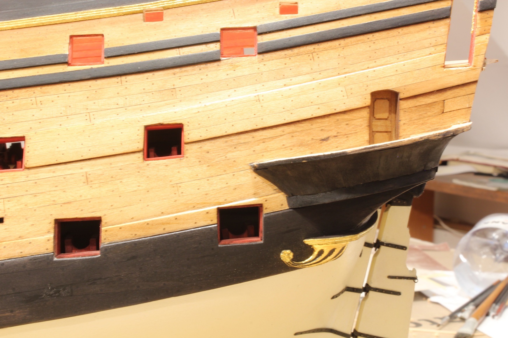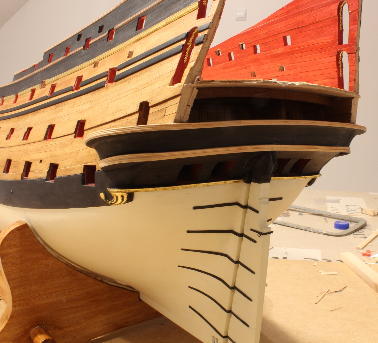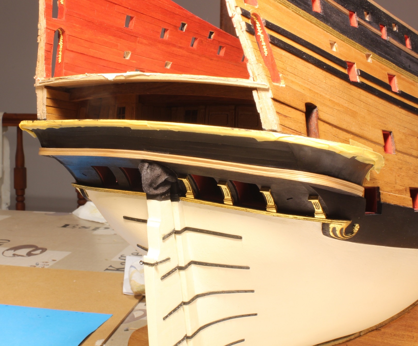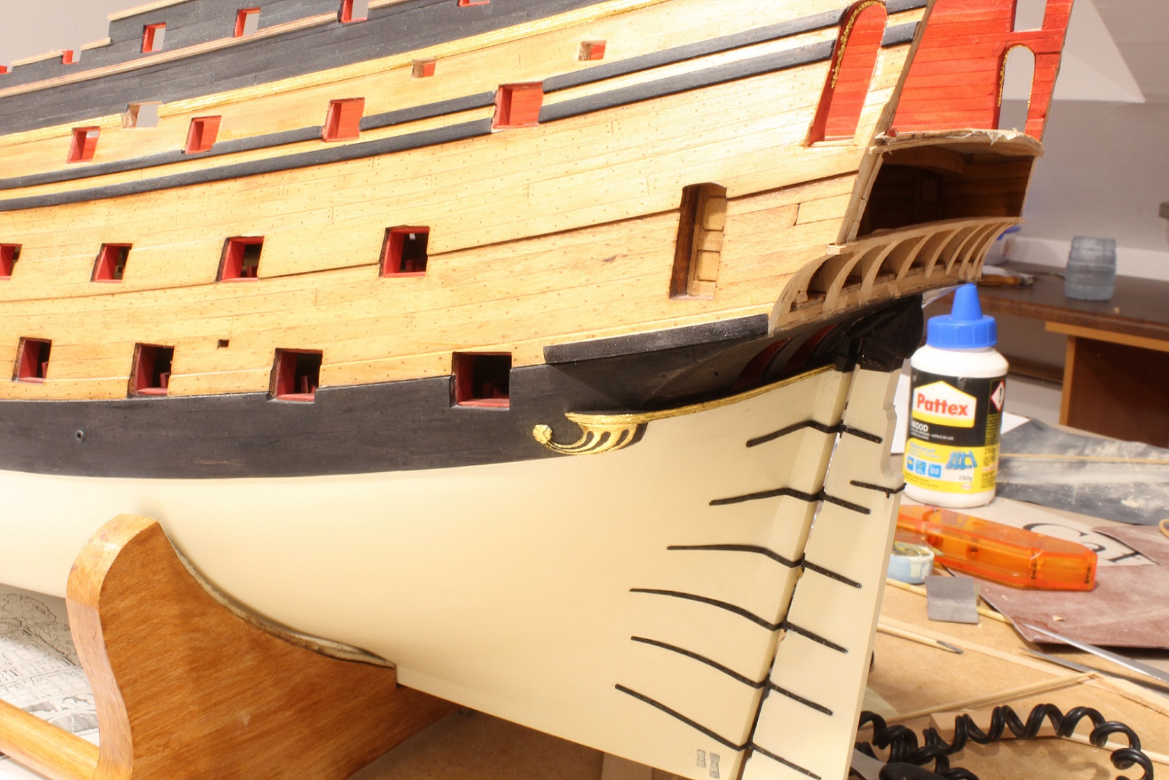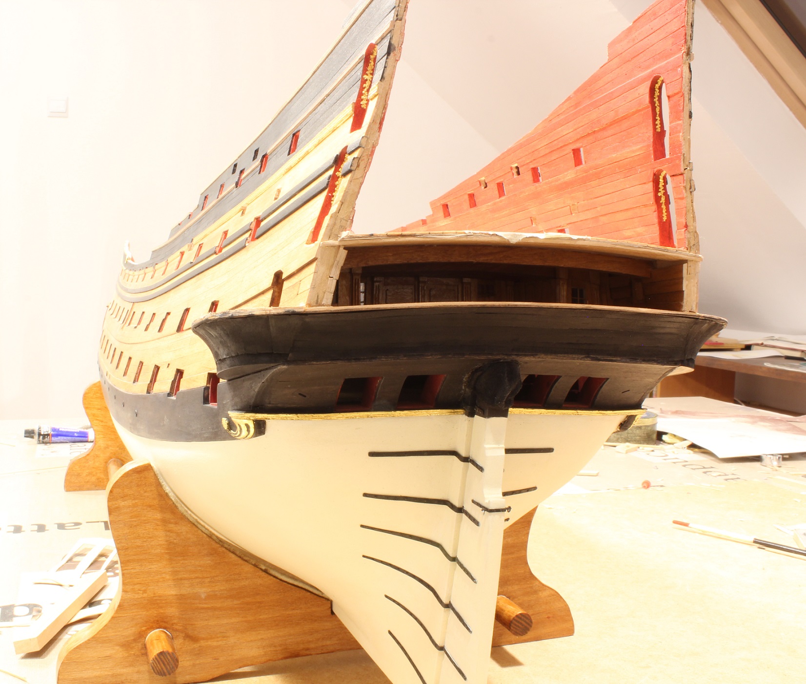 Zrobiłem nowe (poprzednie maiłem już cztery przyklejone, w tym dwa pozłocone- wyleciały do kosza), starałem się wzorować na tych co mi bardziej w oko wpadły. Mam gotowe nowe cztery na prawej części pawęży rufy