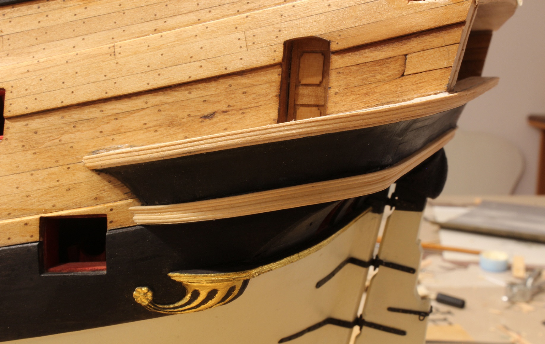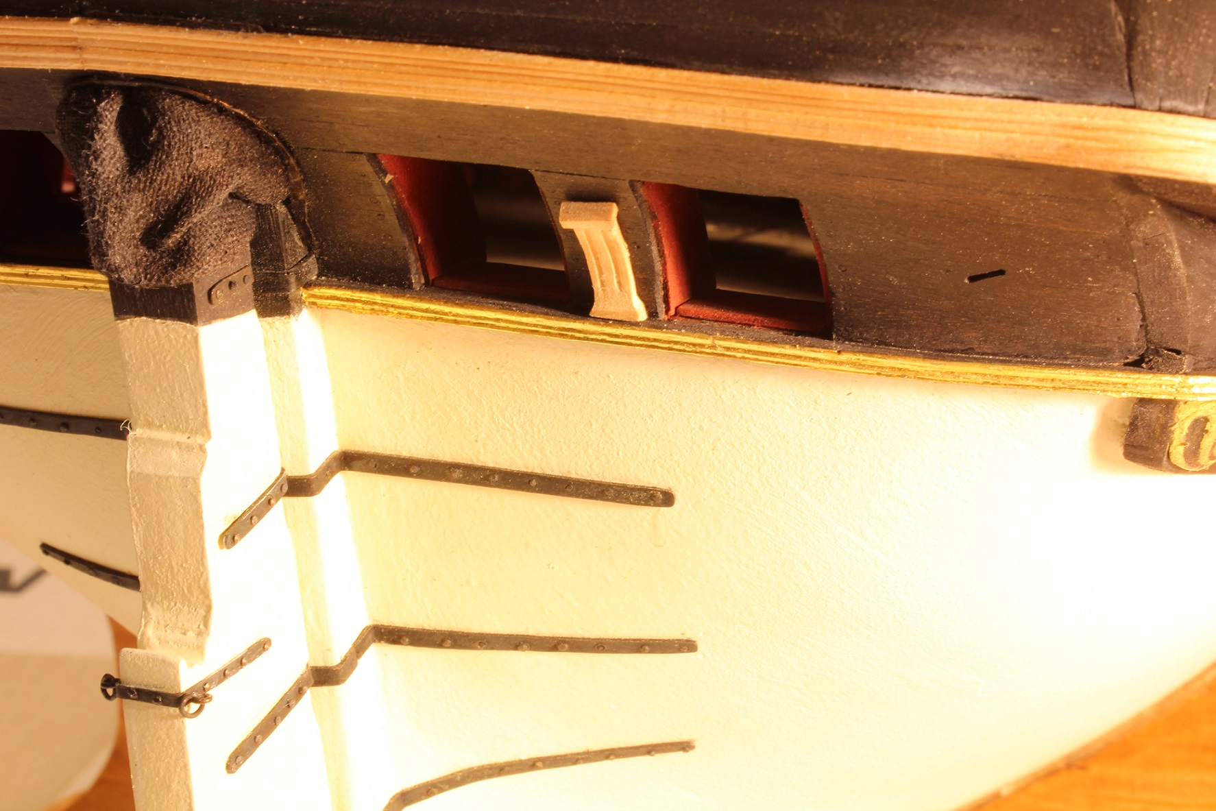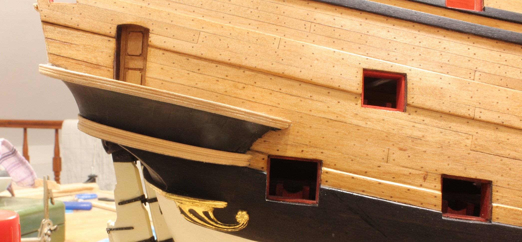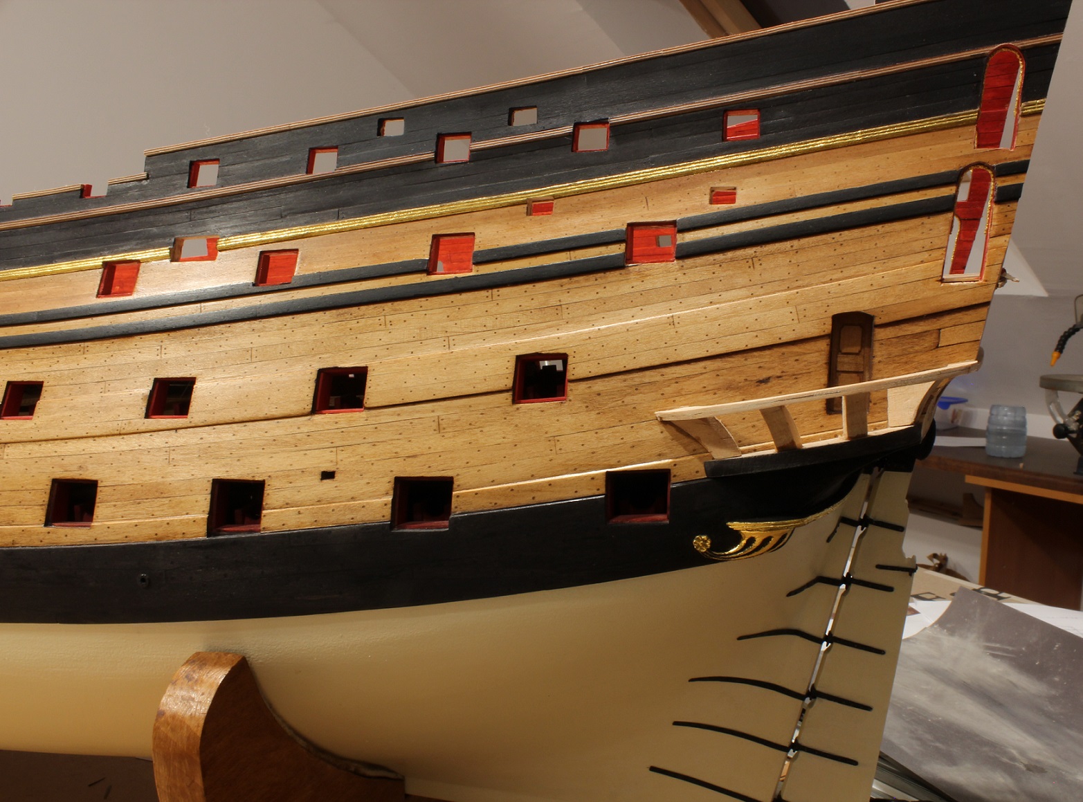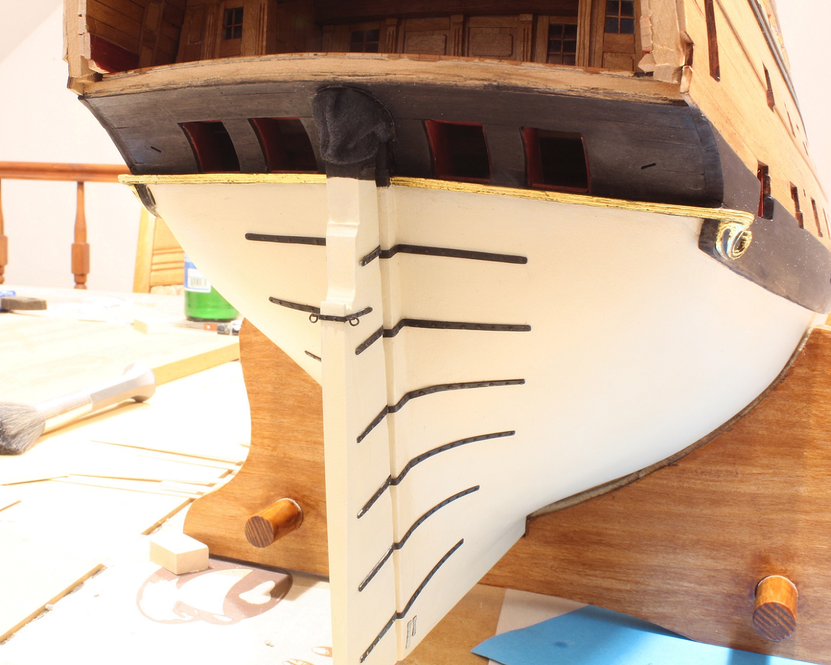 Zrobiłem nowe (poprzednie maiłem już cztery przyklejone, w tym dwa pozłocone- wyleciały do kosza), starałem się wzorować na tych co mi bardziej w oko wpadły. Mam gotowe nowe cztery na prawej części pawęży rufy