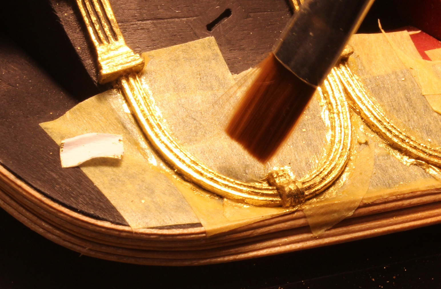 Witaj. Cięcie i nanoszenie jest największym problemem .Zamiast papieru od drukarki stosuję bardzo cienki papier jak papierosowy .Tnę go na format złota nakładam na płatek tak ze znajduję się pomiędzy dwoma papierkami .Potem przy pomocy metalowej linii i skalpela tnę na dowolne wymiary .Przenoszę taką kanapkę pincetą .Jest też płatek jakby przyklejony do papierka .Dostałem kilka arkusików i do pracy na modelu jest idealny .Można go dowolnie przemieszczać i nie odpada a po dociśnięciu pozostaje na detalu .Gdzie można kupić nie mam pojęcia .Detali złoconych na modelu nie izoluję taśmą tylko starannie smaruję klejem i aktywatorem .Złoto bez kleju odpada .Detale z drewna należy mocno impregnować i polerować .Nie zawsze mi wychodzi ale widać różnicę Źle zaimpregnowane jest matowe . Adam powodzenia .Z czasem nabierzesz wprawy .Pozdr.R