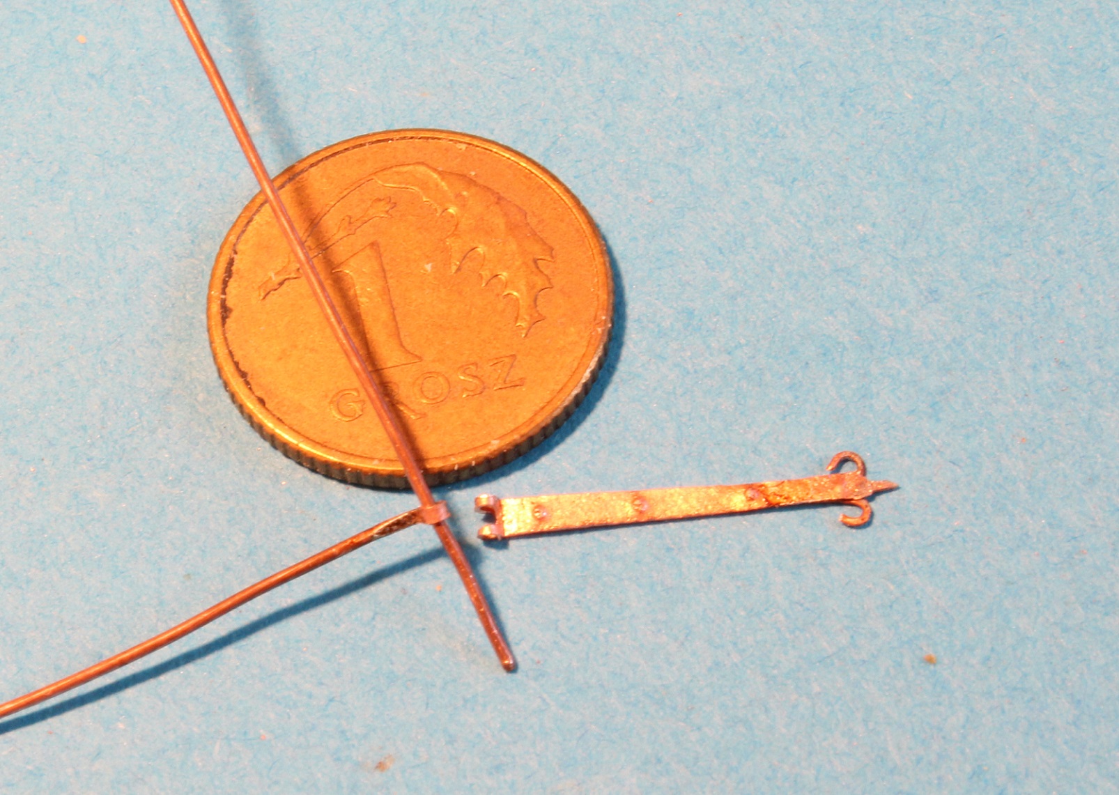 A na tą chwilę dłubałem zawiasy. Ruchome zrobiłem, łatwo się je pod odpowiednim katem ustawia przy burcie. Trochę mi z tym schodzi. Dopatrzyłem się na fotkach gotowych wersji RW, ze kowal od okuć miał fantazję- wąsy robił przy każdej odkuwce zawiasu. Ja je musiałem wlutować. Jakoś wyszło. Pierwsze dwie klapy furt wiszą