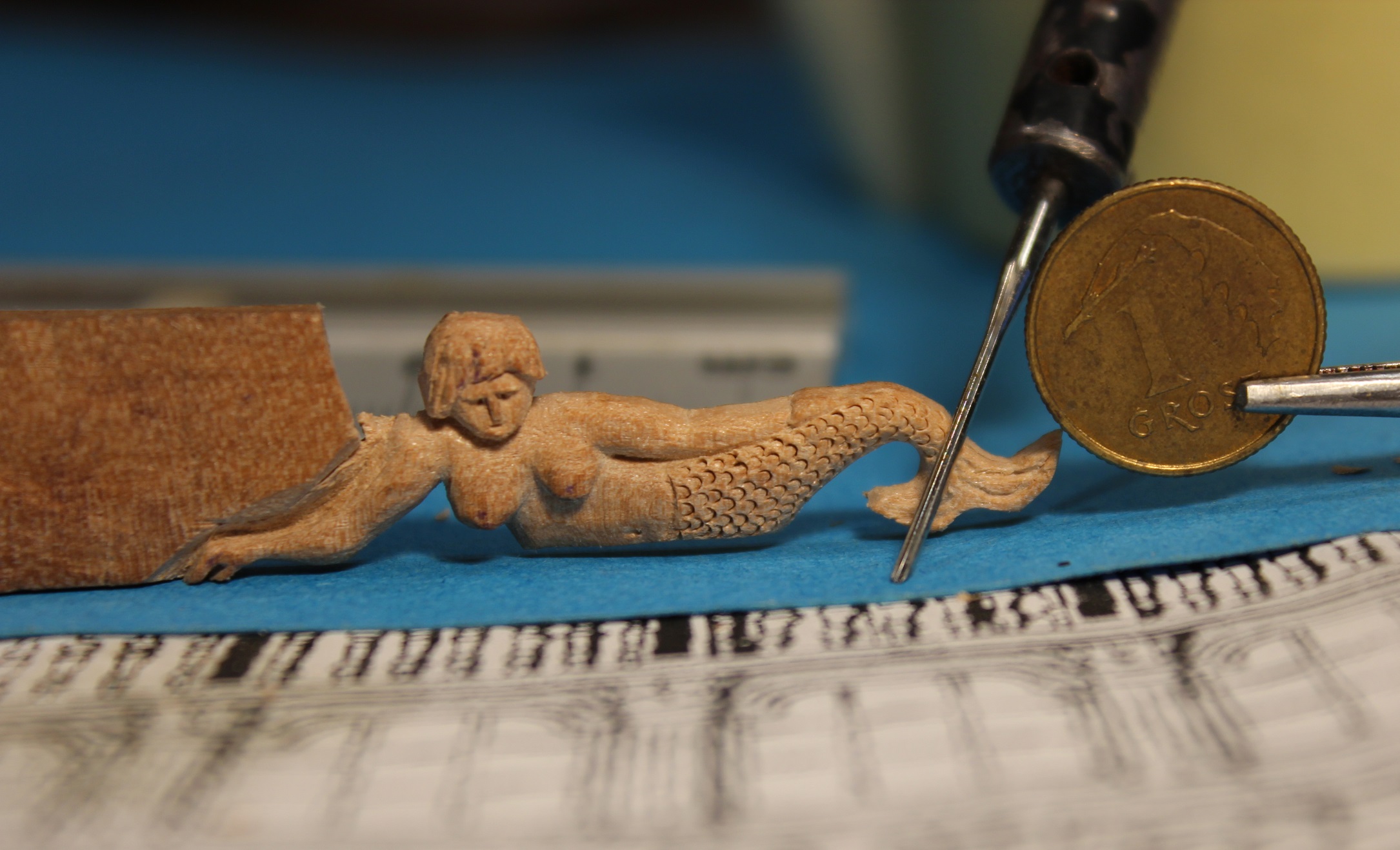 Wciąż przy tej budowie błądzę. Ale dziś jestem zadowolony z dłubaniny. To co poniżej to około jednej godziny dłubania. Spokojnie przy szklaneczce moich jesiennych wyrobów powstawała drewniana wersja syreny. Zastopowałem na dziś przy cycach i podgardle. Wpływ szklaneczek może być aż za pozytywny;)