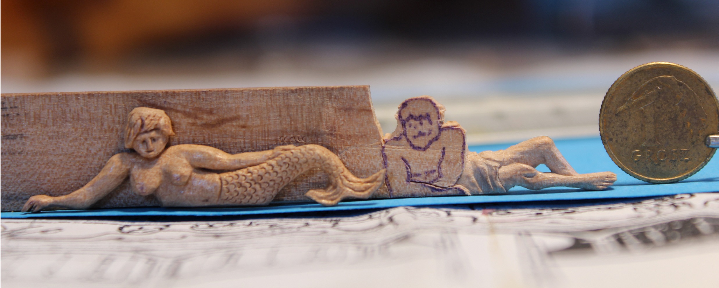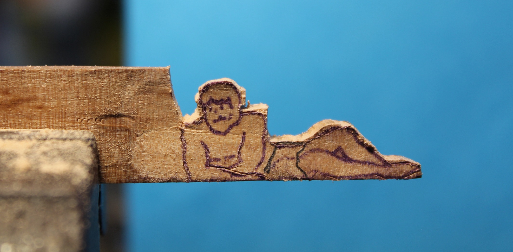 Jeżeli jest taka możliwość to piłką nacinam od strony wrażliwszych elementów. Solidniejszy bok rzeźby zostawiam jako mocowanie do całej listwy. Lepiej się taki drobny element trzyma w łapach. Odcinam od całości gdy większość rzeźby jest gotowa. Było to widać przy syrenie