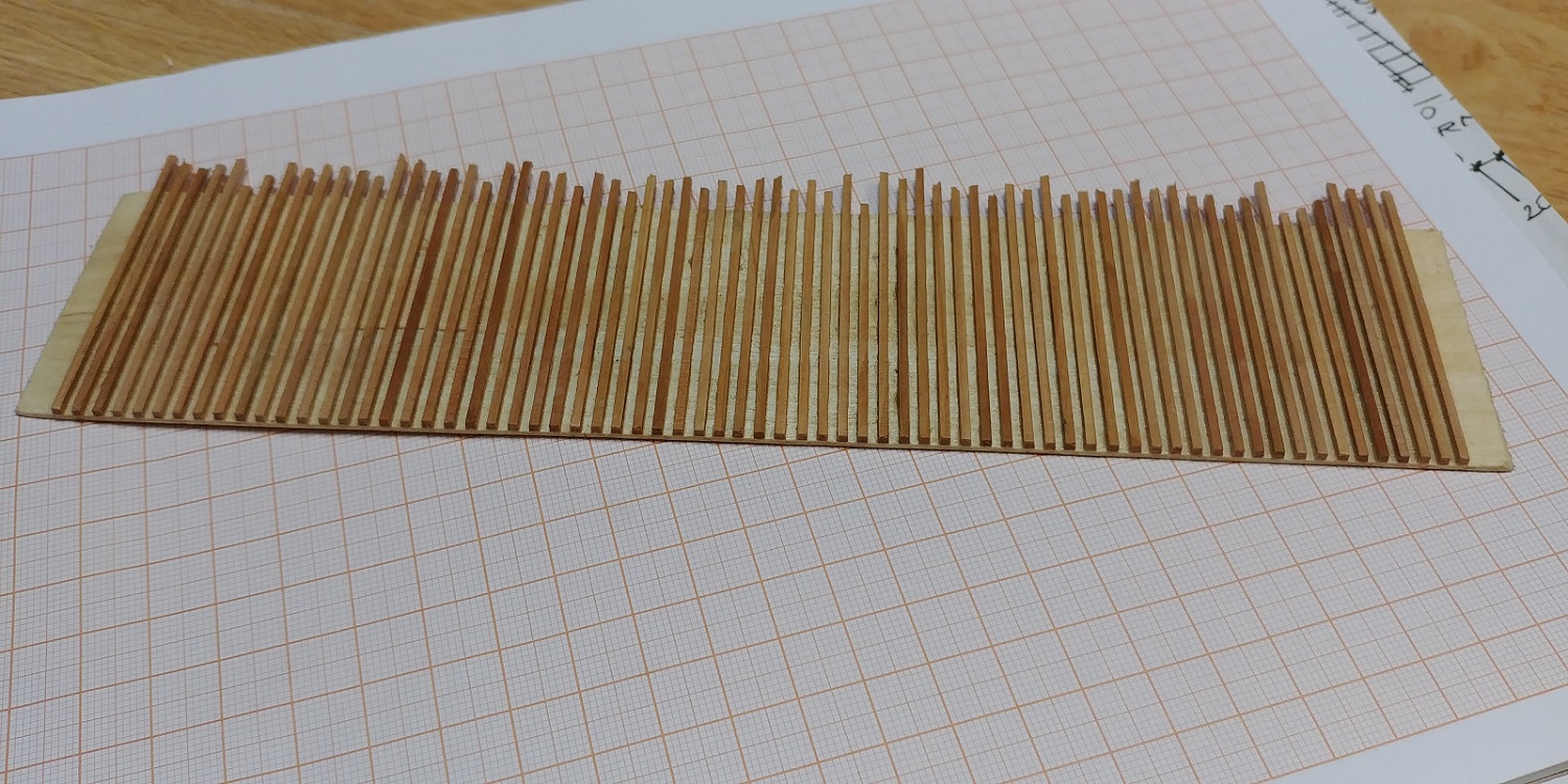 Prace ruszyły.Zacząłem od pasowania pokładów i gretingów.Swego czasu pisałem,że wypróbuję inny sposób budowy gretingów bez frezarki.Zainspirował mnie kol.Piatnik parę lat temu podobną metodą z pasków forniru.Aby być pewnym,że klejone ząbki nie będą się odrywać w czasie cięcia wzmocniłem je kaponem i tak utwardzone nie odpadł ani jeden.