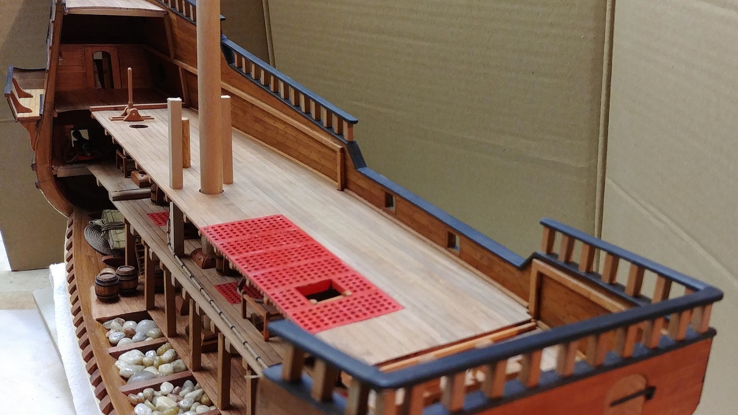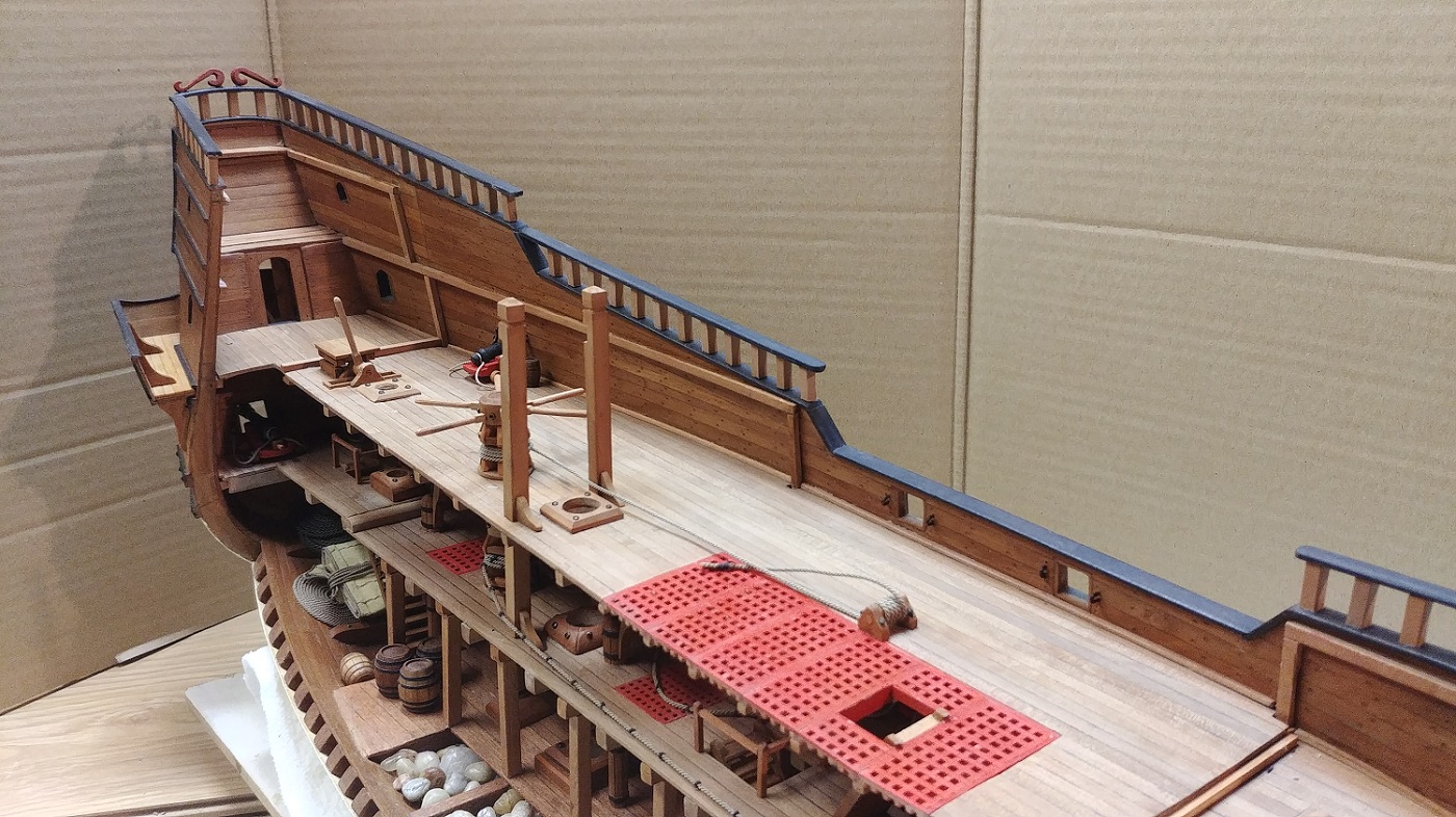 Ciąg dalszy zabudowy pokładu.Balast przyklejony przezroczystym klejem BCE.Liny kotwiczne współdziałają z kabestanem.Lawety umocowane.Ster będzie uruchomiony jak dojdę pokład wyżej.Tu jeszcze parę beczek,jakieś lampy i stół do grania w kości.
