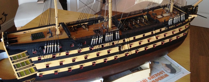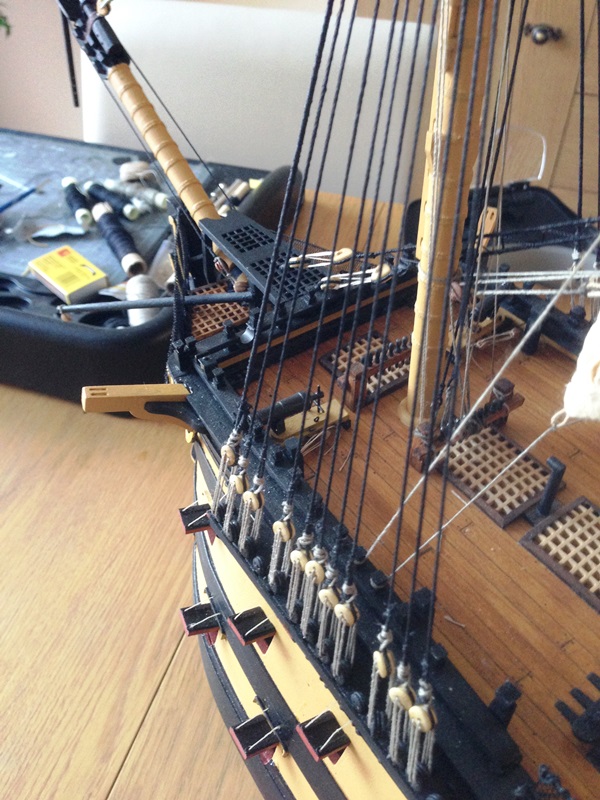 Zaczęły się sznureczki. Na pierwszy ogień poszły wanty fokmasztu. Wydawnictwo proponuje wiązanie węzłem płaskim ja spróbowałem naśladować oryginał. Troche to trudne przy zbudowanym maszcie, ale jakoś sobie poradziłem: