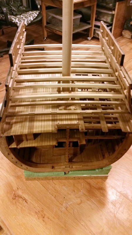 Główny pokład działowy jest skończony i można robić armaty i wyposażenie. Doszedłem jednak do wniosku, że musze przygotować konstrukcję kolejnych pokładów. Jak widać na zdjęciach wsporniki wymagają dużo dopasowywania.