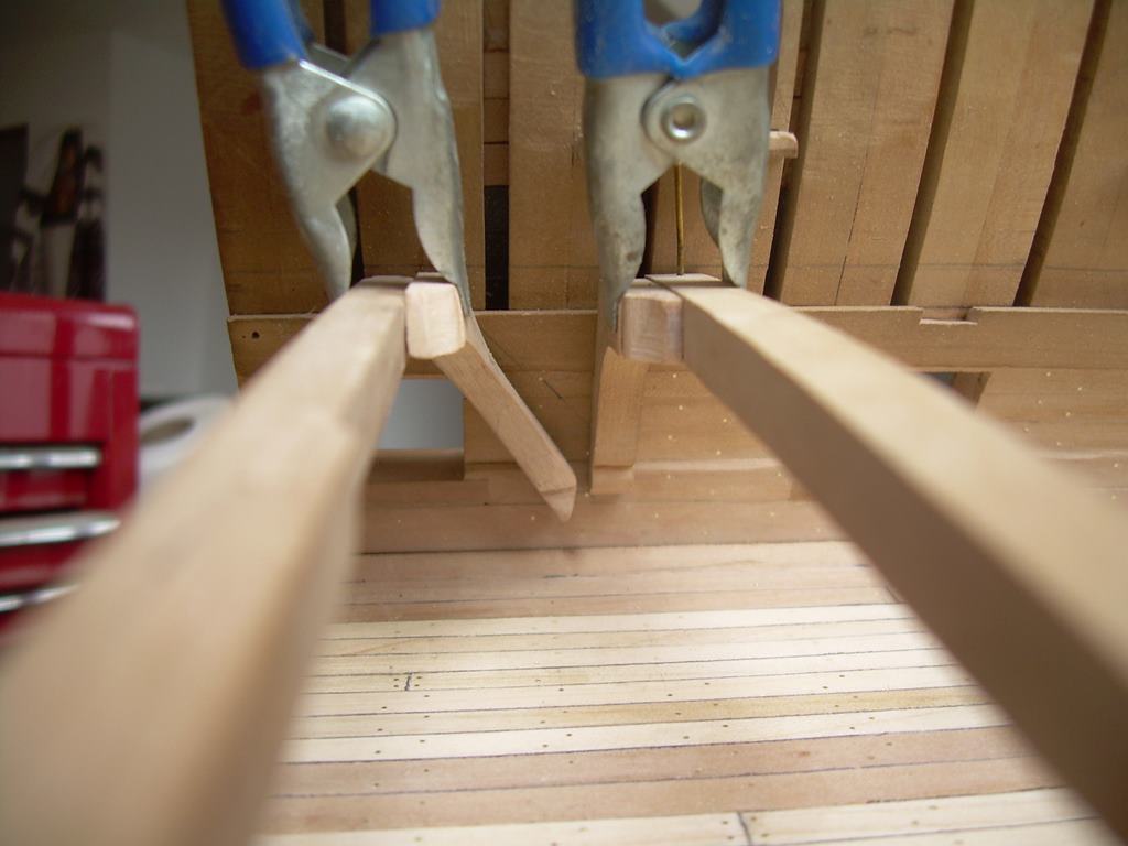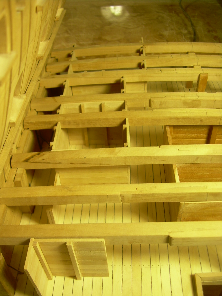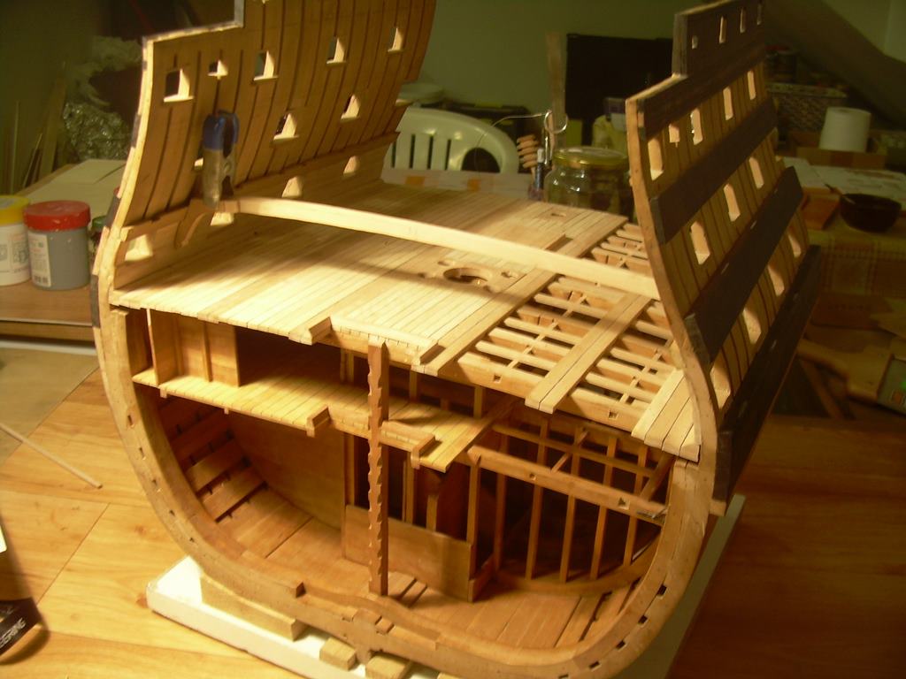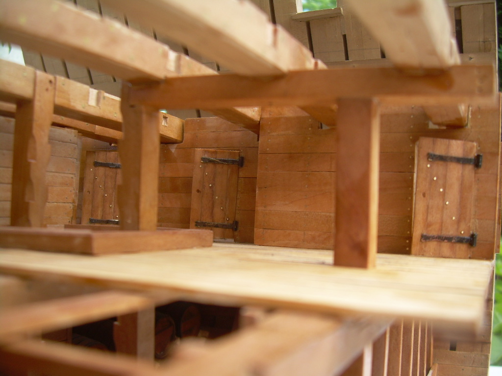 Główny pokład działowy jest skończony i można robić armaty i wyposażenie. Doszedłem jednak do wniosku, że musze przygotować konstrukcję kolejnych pokładów. Jak widać na zdjęciach wsporniki wymagają dużo dopasowywania.