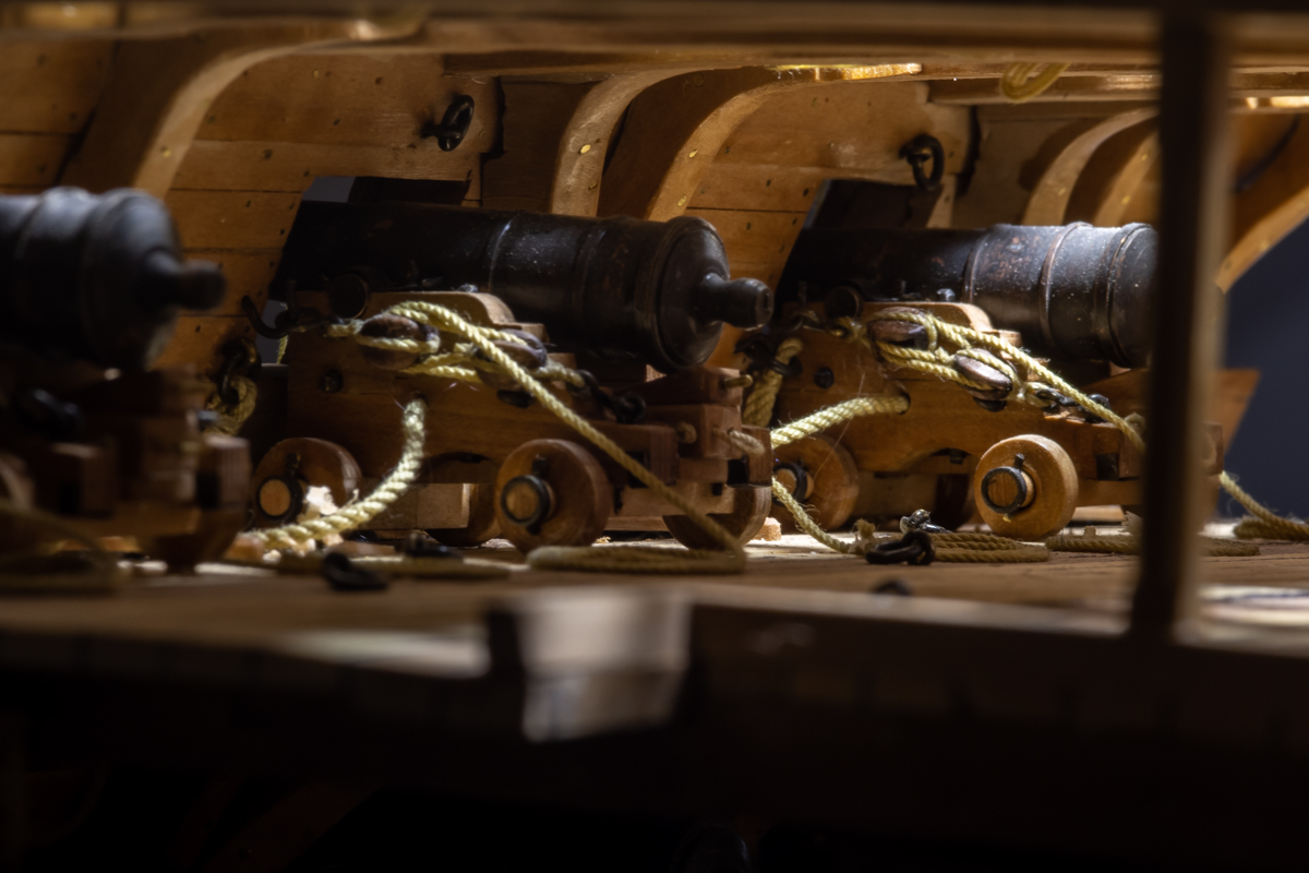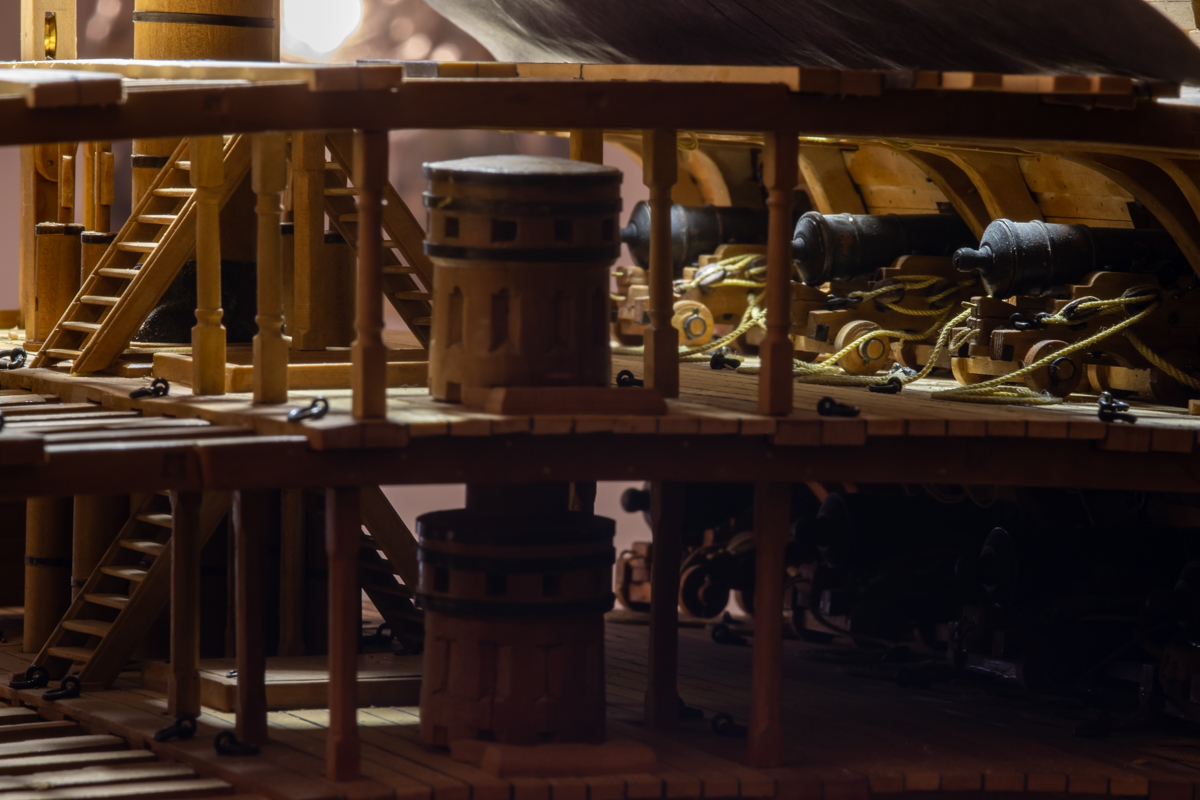 Wyposażenie kolejnego - czwartego już pokładu - zbliża się do końca. Zrobione armaty 12ft i pozostały talie i kilka profilowanych słupków.