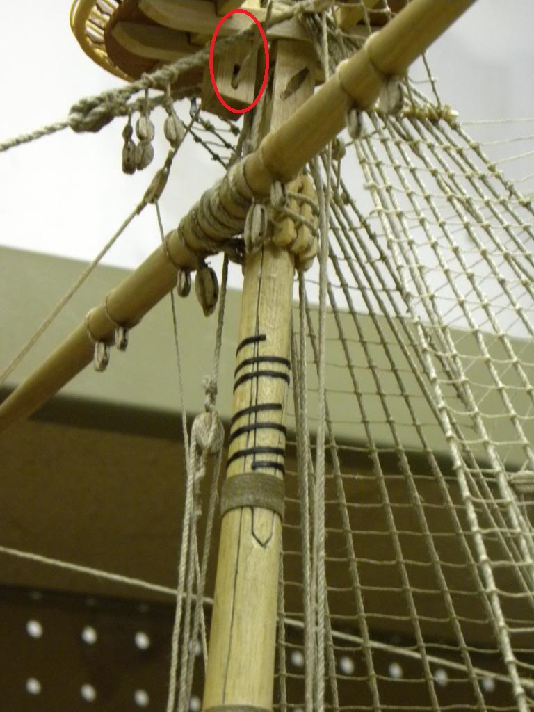 Na modelu Claytona przy bloku w bezanmaszcie od strony pawęży widać jakby "pieczęć" na linie,