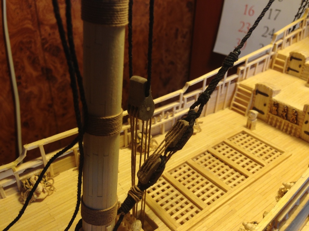 Na modelu Claytona przy bloku w bezanmaszcie od strony pawęży widać jakby "pieczęć" na linie,