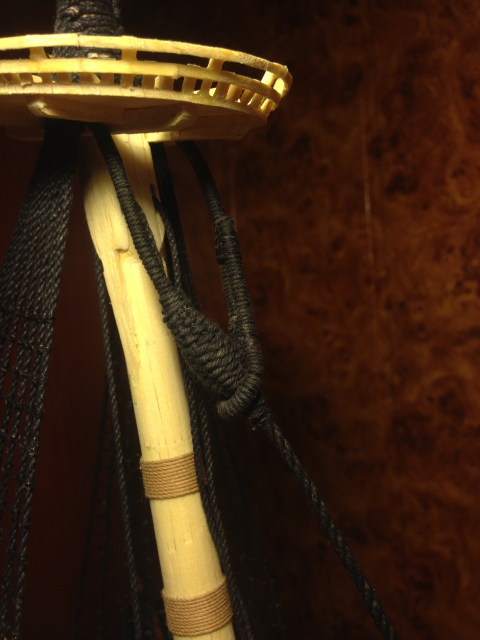 Zawiązałem wyblinki na wantach grotmasztu, oraz na sztagu zrobiłem "pełnoprawną" gałkę.