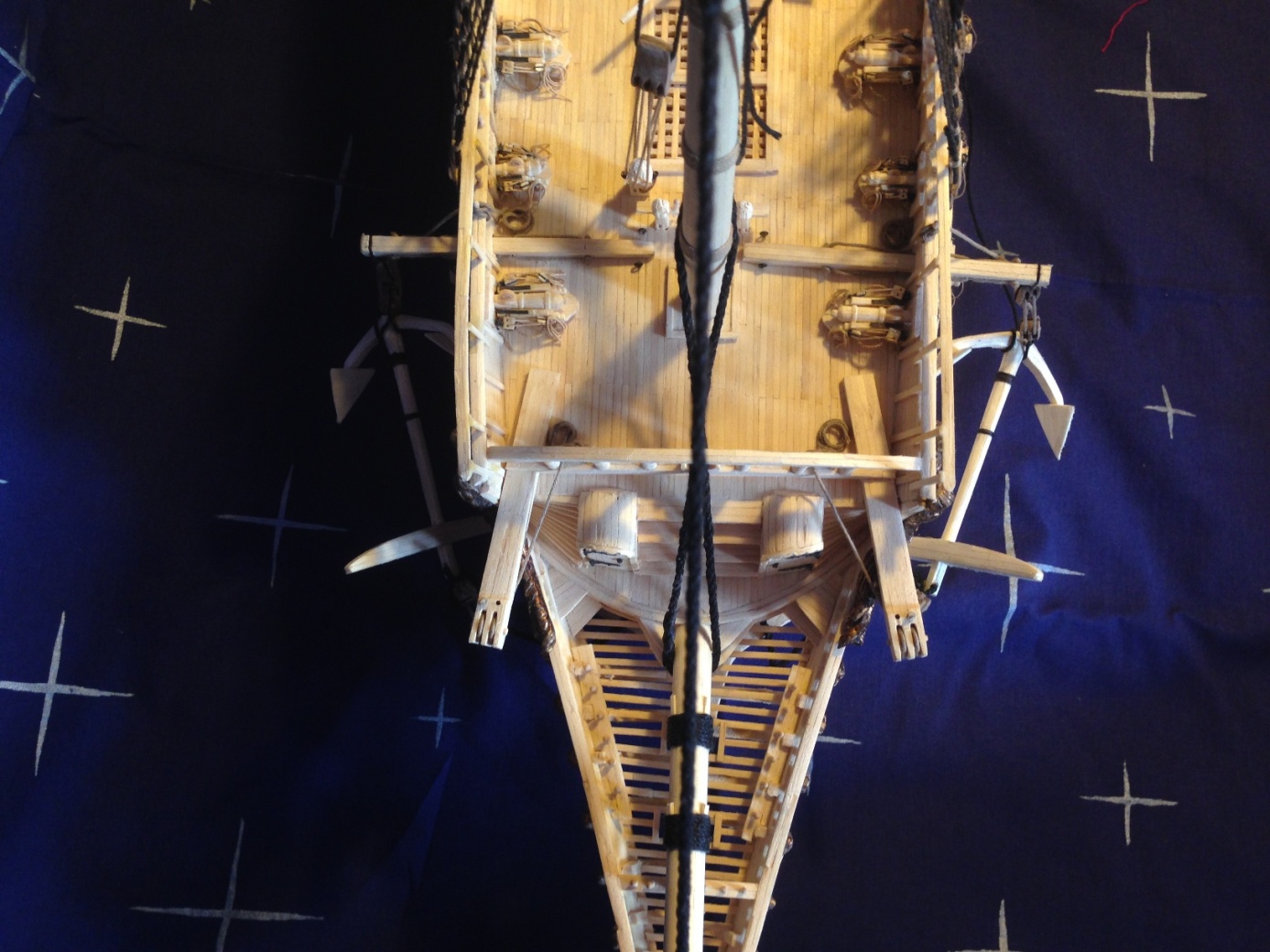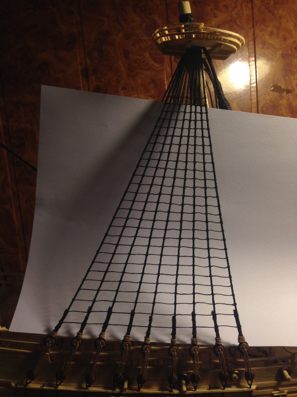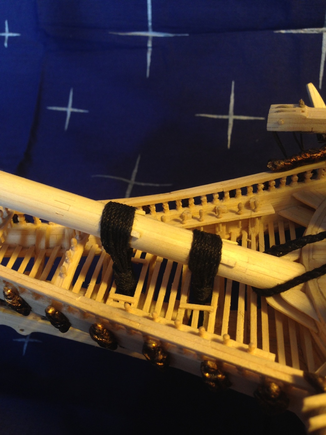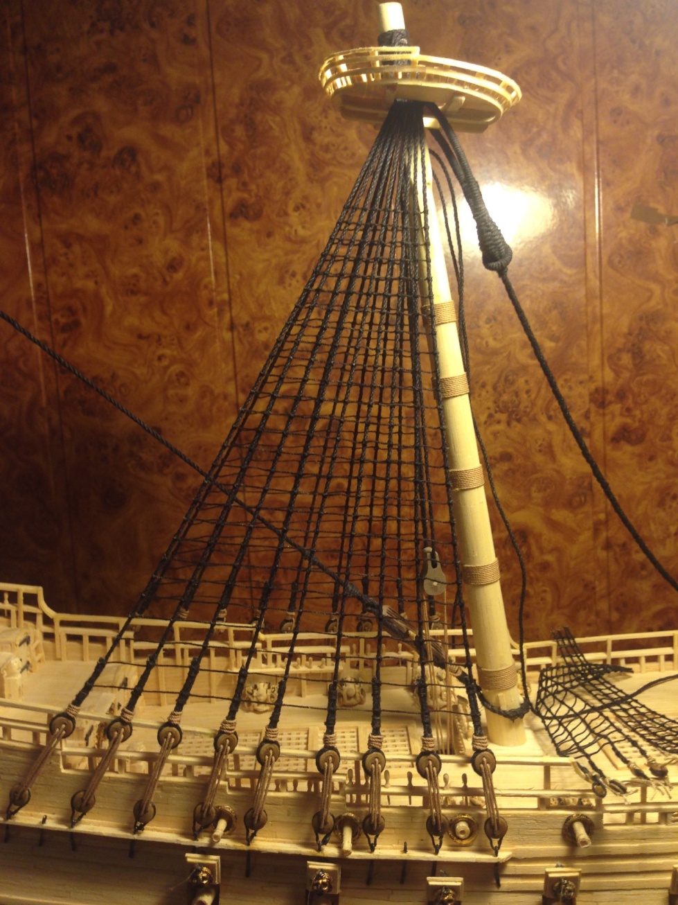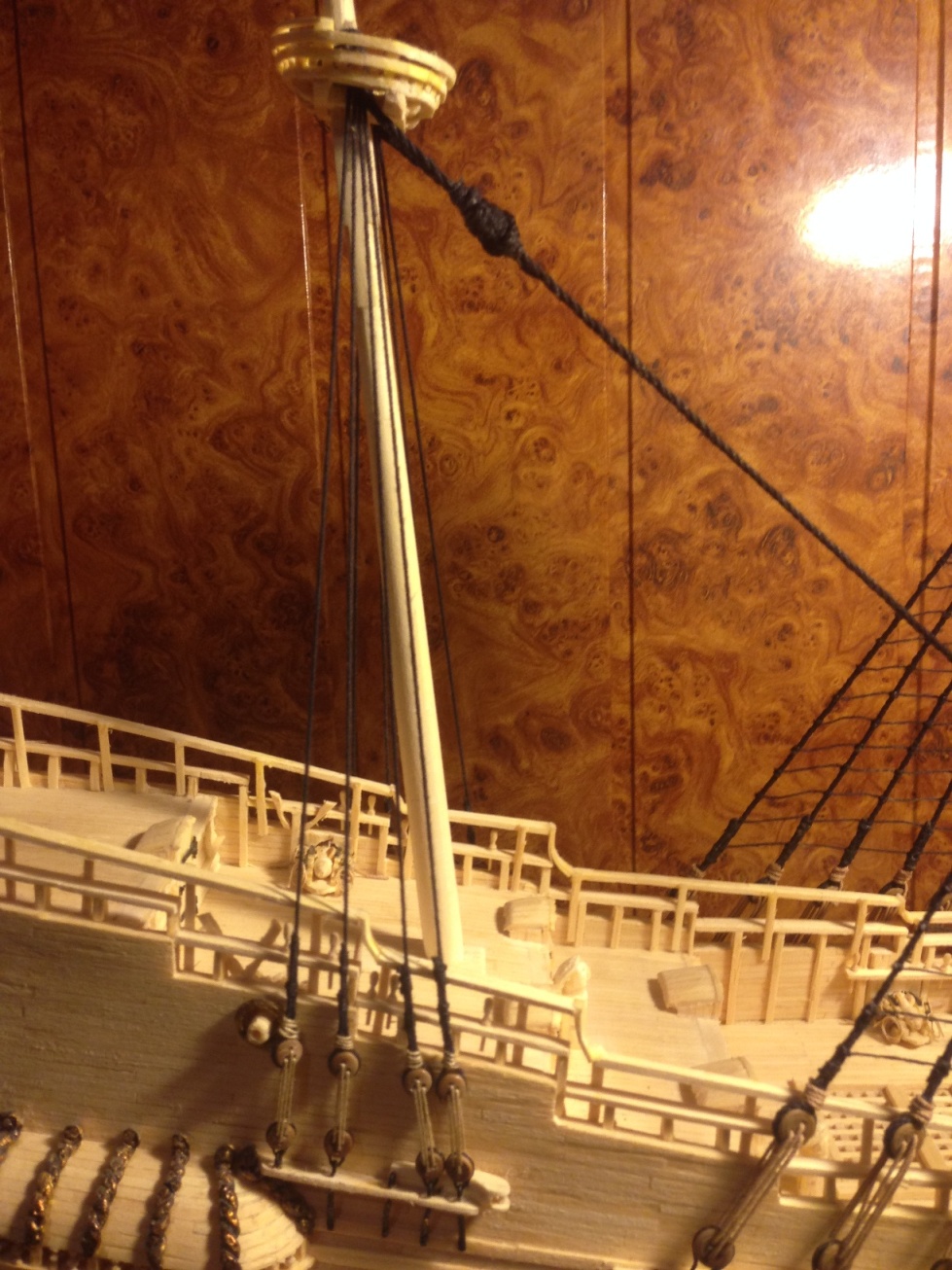 1) W jaki sposób mocowany był wyższy poziom masztu, gdzie była uwiązana ta lina, nie udało mi się tego dojrzeć na żadnym z modeli. Wydaje Mi się,że ma to związek z hakami umieszczonymi przy połączeniu masztów.