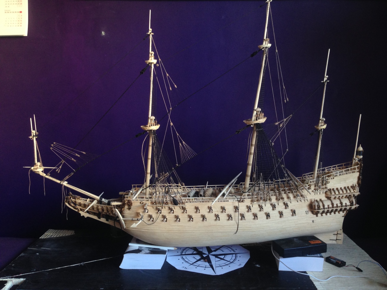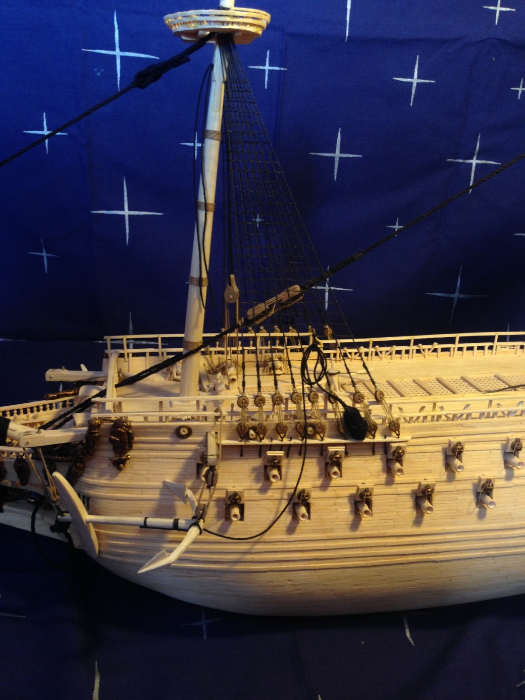 Praca poszła całkiem sprawnie i przyjemnie, jednak problem jest z miejscem. Jak by nie patrzeć jest to spory model i w pokoju 12m^2 w bloku, ciężko jest przechodzić z 1 burty na 2gą. Jednakże udało się manewrować biurkiem. Od linek po zamontowaniu niestety odstają włoski, powinienem je opalić aby nie było ich aż tak bardzo widać, ale działanie otwartym ogniem przy 4 latach pracy nie napawa mnie optymizmem.