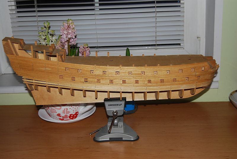 Z pierwotnie raczej obłupanych niż obrobionych klocków lipowych wypełniających dziób wykonywałem wypełnienie . Okazało się że szablony na planie różnią się od tego co ma być założone na okręcie o 5 mm na wysokość. Trzeba było trochę pomyśleć żeby do tego dojść i na sucho spasować całe wyposażenie na dziobie. Tak więc ktoś tam z Corela przedobrzył a lajkonik co wcześniej konstruował założył poprzednio tak jak dostał.