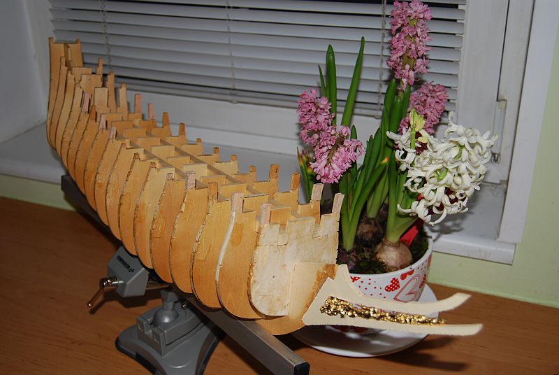 W poniedziałek dotarł do mnie nowy nabytek. Z całego zestawu brakuje jedynie mały lew który jest nad galionem dziobowym czyli dużym lewem, i szalupy. Zestaw jak po notatkach na instrukcji wnioskuję pierwotnie był zaczęty przez jakiegoś Skandynawa i wyprodukowany w roku 1985 może 1984 . Wczesna wersja produkowana przez firmę COREL. Wszystko wycinane frezem na każdym elemencie są dziurki po kołkach utalających. Ów Skandynaw miał chyba blade pojęcie o szkutnictwie, Na szczęście to co widać na zdjęciach jest posklejane jakimś przezroczystym klejem który łatwo się poddaje acetonowi ulegając rozpuszczeniu. Wręgi są w ogóle tylko po stykane bez kleju. Dwie wręgi nawet pomylił. Wyszedł z założenia że po co tam dawać klej jak ładnie pasuje