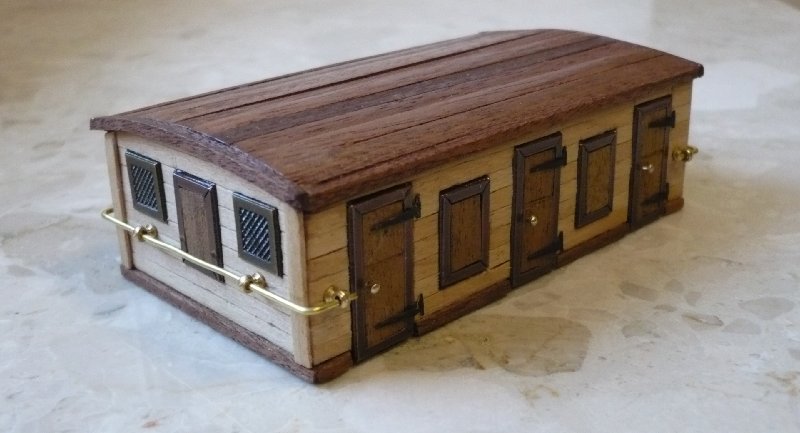 Poszycie kadłuba wreszcie skończone. Pozostało drobne szlifowanie i dopieszczenie szczegółów (na dziobie i rufe). W przerwach wykonywania kadłuba zakończyłem nadbudówkę (kabinę): wprowadziłem trochę zmian w stosunku do instrukcji OcCre tj dach z listewek, drzwi i okna wpuszczone w listwowanie ścian, dodałem zawiasy do drzwi i relingi na szczytach. Jedne z drzwi wykonałem otwarte z uwagi na planowane umieszczenie figurek marynarzy i żołnierzy na pokłądzie (jeden będzie otwierał te drzwi :D )