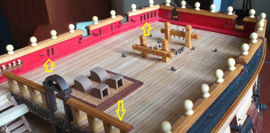 Powoli przybywa nowych elementów. Knagi (metalowe) przyklejone. Poręcze oddzielenia pokładów zostały wyfrezowane, pobejcowane i wklejone. Zakończenie na rufie (pawęży) w trakcie wykonywania - oczywiście kolejny "zonk" w elementach OcCre - szprosy nie pasują do okien - trzeba było wykonać nowe - złocenia także zakończone - teraz tylko obramowania z drewna i "na model".