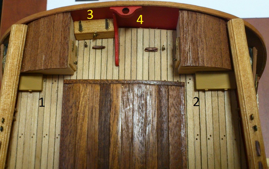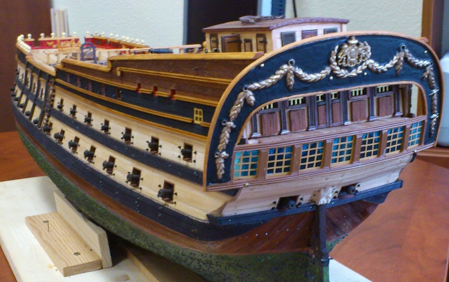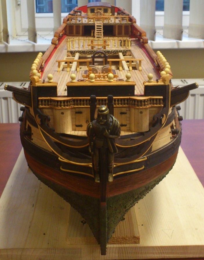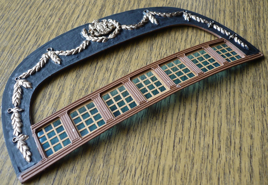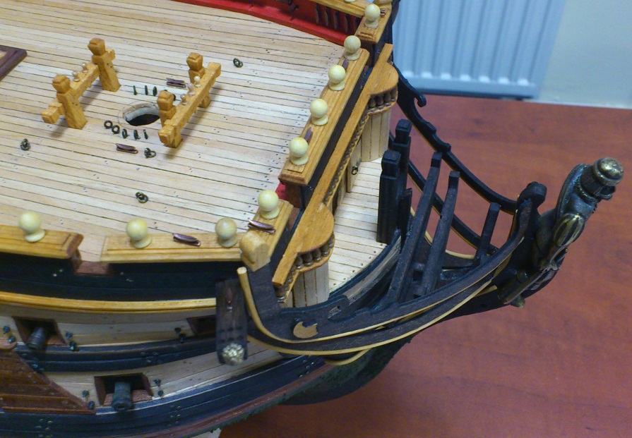 Powoli przybywa nowych elementów. Knagi (metalowe) przyklejone. Poręcze oddzielenia pokładów zostały wyfrezowane, pobejcowane i wklejone. Zakończenie na rufie (pawęży) w trakcie wykonywania - oczywiście kolejny "zonk" w elementach OcCre - szprosy nie pasują do okien - trzeba było wykonać nowe - złocenia także zakończone - teraz tylko obramowania z drewna i "na model".