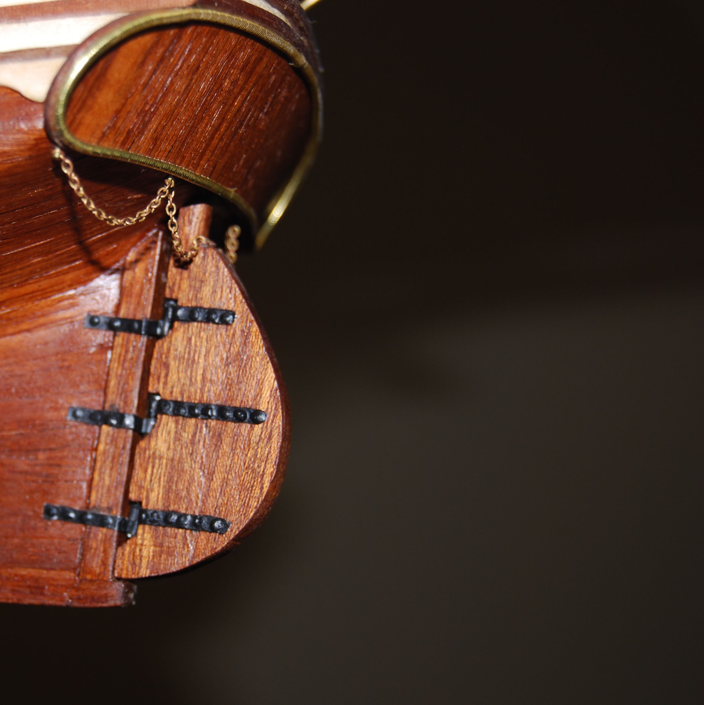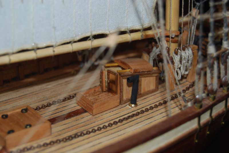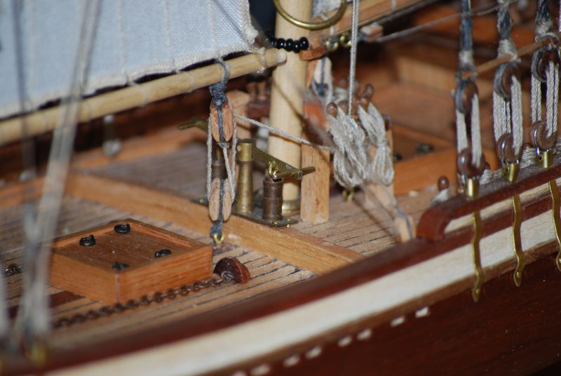 Wymęczona winda. Wymęczona z braku narzędzi do obsługi metalurgii ale jakoś to wyszło. Podstawowa część do machania jest z zestawu. Reszty nie było. Sama machaczka miała wisieć w powietrzu i to jeszcze wbita od góry w jarzmo bukszprytu. Żałuje że jej nie wymieniłem ale z drugiej strony i tak nie miałbym jak polutować nowej. Biała zębatka czerniona farbą jest ze zużytej kocówki od cyjanopanu. Idealnie wręcz podpasowała. Zostawiam całość w kolorze mosiądzu jak i inne detale na jednostce również.