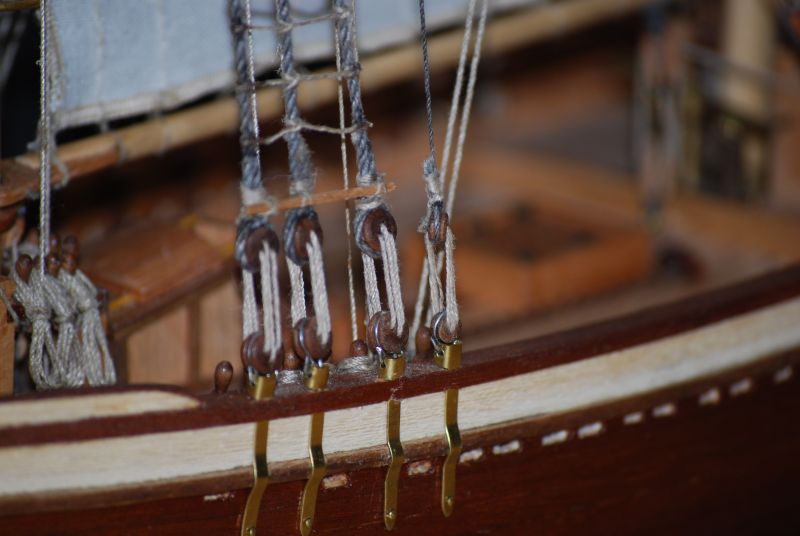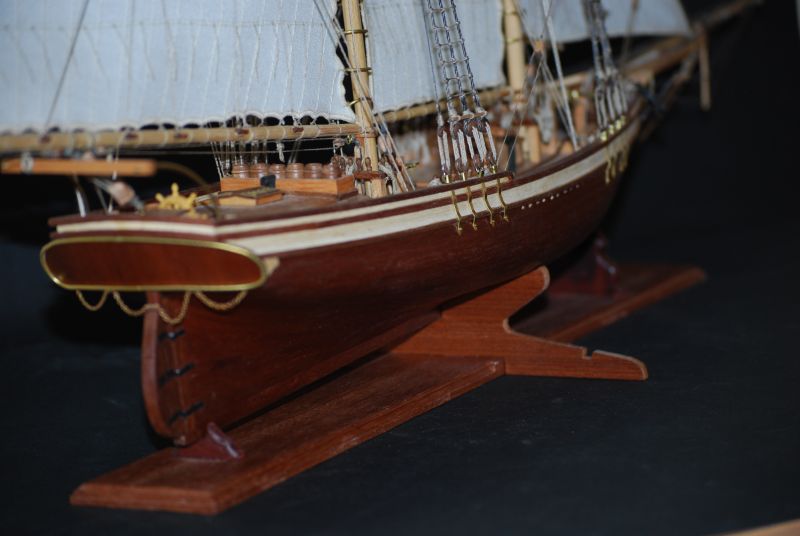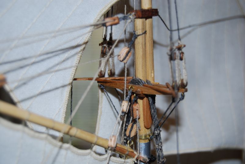 Tak stał i stał aż stwierdziłem że z prostymi żaglami to jest nudny jak flaki z olejem. Postanowiłem metodą lakieru damskiego do włosów sztywności D( ponoć najmocniejszy go ożywić ). Oczywiście przeciwko był na przykład czynnik że materiał na żagle nie był wcześniej sprany i teraz kurczą się żagle o 15 procent w stosunku do wymiaru jaki jest przed moczeniem. Trzeba pamiętać że żagle już są na okręcie za wyjątkiem jednego, co czyni operację tym bardziej upierdliwą. Ale co tam. Zaczynam od gafla. Pierwsze nałożenie i widać że żagiel przesiąka. Układam okręt płasko na parapecie a do sznurków żaluzji mam przymocowany podwójny worek z wodą. Sprawdziłem iż wcześniej nie ciekł. Został tak zawieszony nad żaglem aby był tylko nacisk wody. Z uwagi na dużą pojemność położenie worka swobodnie powodowało niekontrolowane jego ułożenie, stąd potrzebne podwieszenie. I tak pozostawiłem do samoistnego wyschnięcia. Powstały plamy w wyniku kurzu oraz przecieku wody. Niby małe kropelki ale z lakierem jakoś tak dziwnie przereagowały że w tym miejscu żagiel uzyskał jakby przezroczystość. Za dużo nałożyłem lakieru jednorazowo to inna sprawa a i sam żagiel po 26 latach leżakowania w różnych warunkach widocznie był równomiernie zakurzony. Balon z wodą się nie spisał a z piaskiem nie próbowałem. No to spieranie żagla na okręcie !!! Masakra. Jakoś się udało żeby był biały. Skomplikowanym systemem blokowania mokrego żagla udało się nie dopuścić do skurczenia. Po 2 dniach walki 3 dnia udało się uzyskać wypukłość na gaflu i opanować lakier do tego stopnia aby uniknąć plam i uzyskać właściwą sztywność. Wymagana sztywność została uzyskana po 3 - 4 naniesieniach. Oczywiście suszarka i to mocna też okazała się bardzo pomocna. Tydzień czasu robiłem podejścia jak koło jeża do okrętu. Zdjęcia z lampą błyskową pokazują załamania na żaglach które w rzeczywistości są niewidoczne. Do zrobienia pozostała reszta linek która układa żagle we właściwy sposób. Na zdjęciach pokazany tylko efekt dmuchania żagli.
