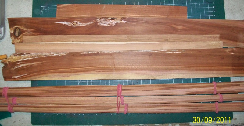 Tym razem listewki brzozowe docięte na grubość 4 mm oszlifowałem w ścierarce grubościowej, następnie pomalowałem miksturą "made in Stefan" - lakier, rozpuszczalnik nitro oraz grafit (czyli materiały których mam w bród po przygotowaniach do metody Baranova...) Po wyschnięciu cięte juz na właściwy wymiar. Teraz czekają na przeszlifowanie i klejenie. Myślę że tym razem będzie ok :)