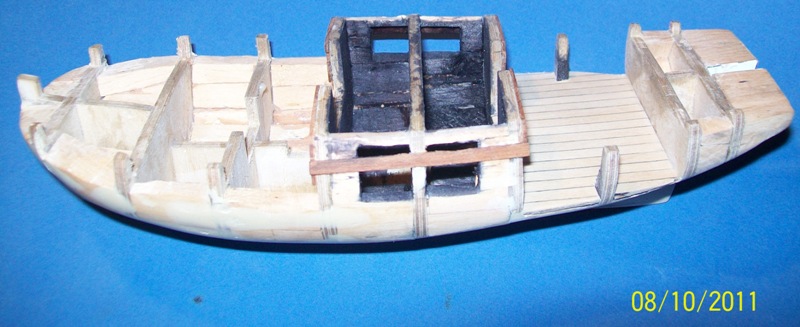 A tu sobie zamontowałem jeden pokład - ten tylni. Byłem ciekawy jak się to wszystko prezentuje w "kupce". Dodatkowo wyznaczyłem sobie linię od której będę poszywał burty - chcę to zrobić jak najszybciej, aby odciąć "wąsy" pomocnicze oraz zamontować pokład główny. Wydaje się że listeweczki Mirka będą się bardzo fajnie gięły - podobno po moczeniu w gorącej wodzie jeszcze lepiej...
