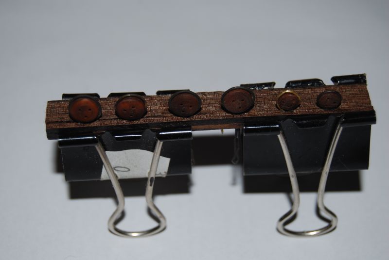 Tak sobie plotę. Nici wantowe plecione z 9 szt do grubości 0,9 mm ((3 x 0,1) x 3)). Przewiąz talrepowa beżowa nic ariadny ADA 15. Wiązania tą samą nicią tylko czernioną. Czernienie bez fanaberii pastą do butów kupioną w Ryłko w tubce z wygodnym apliatorem z pianki która o dziwo nie uległa pocięciu. Następnie po wyschnięciu przetarte terpentyną bezzapachową. Docelowo jeszcze przelecę je olejowoskiem. Po tych zabiegach bez opalania rzadnego włosiwia nie widać o dziwo. Całość wiązań poczynione zgodnie z Lennarth Peretersson "Ringing Period Ship Models ". Na zdjęciu nagle znanej firmy :" Jan Niezbędny" potraktowane w odpowiedni sposób mechanicznie oraz barwione bejcą teak. Jeszcze dostaną olejowosku.
