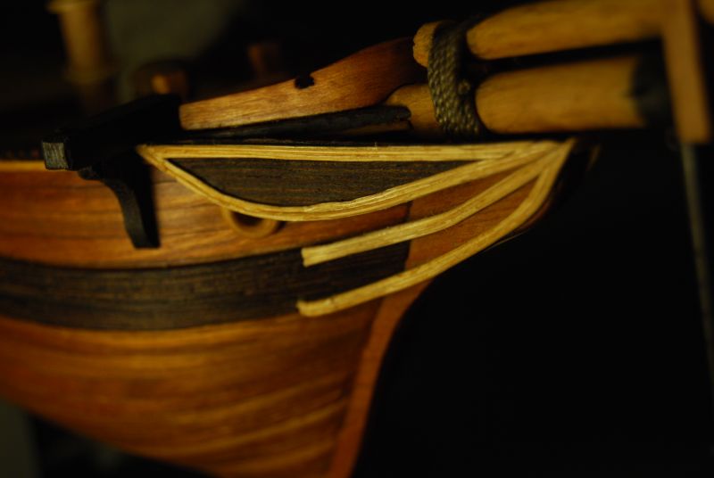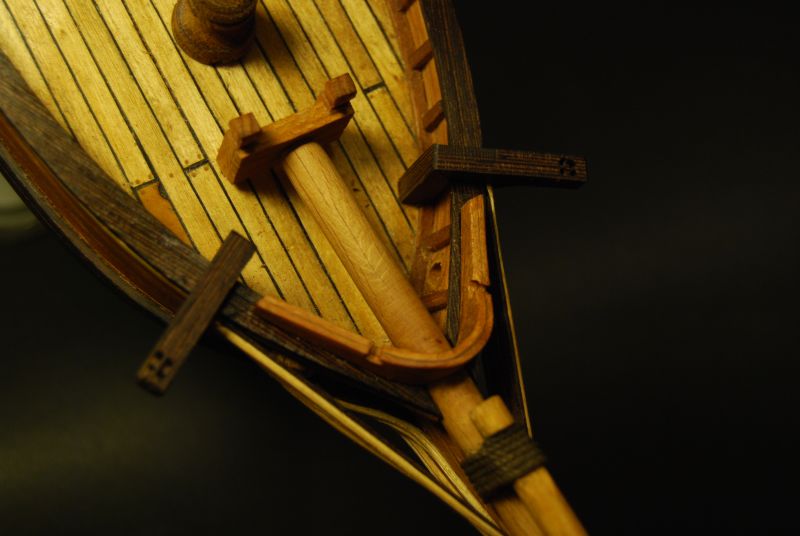 Właśnie się dopatrzyłem że nie ma ciągu relacji. Już się poprawiam. Na planie jest aby uzbroić jednostkę w 6 armat. Wystają one jednak ponad burtę tak jakby jednostka była dozbrojona w okresie późniejszym. Nie wiem czy nie zrezygnować z armat ponieważ kłóci mi się to wizualnie ( armata bez furty pod nią ?) Pokład przy użyciu papieru ze sklepu artystycznego w arkuszu A3 i kołków z wykałaczek wierconych na 0,6 mm wyszedł chyba nie najgorzej. Na lustrze rufy wstawię jeszcze półkoliste rzeźbienie ( jakieś liście ) oraz tabliczkę z nazwą rzeźbioną na proporcu podwójnie przeplecionym. No chyba że powieszę wcześniej szalupę i mi całość rufy za słoni to po co mój trud :-) Roboczo wiszą żagle. Dałem ciała bo nie wiem czy drzewce zostawić takie jasne tylko poolejowane i same ściemnieją czy może je strzelić na teek. Wiąże że to jednak z odcięciem jednego żagla od rei ( czy jak tam ona się zwie na gaflu )