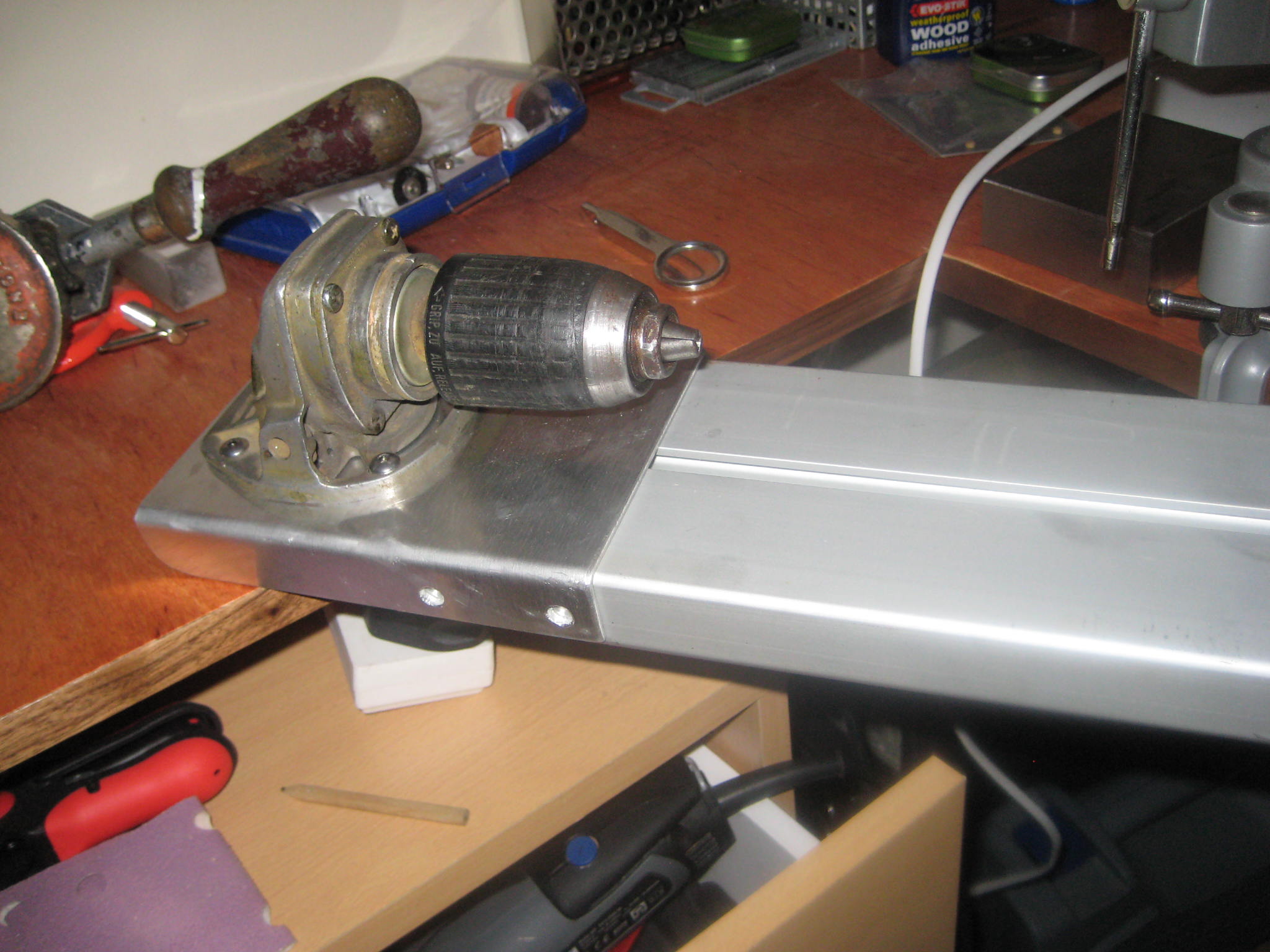 Tylko czy bedzie dzialac? Przekladnia katowa od szlifierki , wrzeciono od wiertarki wszystko przymocowane do prowadnicy tzn.barierki bezpieczenstwa od samochodu ciezarowego.Element od szlifierki redukuje szybkie obroty Dremela ktory calosc napedza. Popracuje nad konikiem przesuwanym po prowadnicy i wtedy zobaczymy jak to dziala.Simple and efective...mam nadzieje.