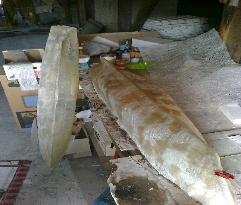 Po Lewej kadłub do wywalenia ponieważ używałem małych kawałków maty szklanej i wyszedl strasznie nierówny a drugi jest narazie po pierwszej warstwie, powierzchnia wyszła równiejsza bo używalem dużych kawałków maty. Po drugiej warstwie żywicy z matą nałoże szpachle i szlifowanie