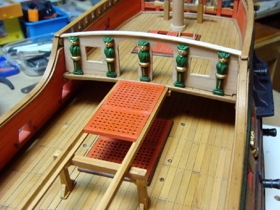 Tym razem podest,pomost na śródokręciu.Pomost rozbieralny bo pod nim miejsce dla jolki.Dla załogi duże utrudnienie kiedy jolkę trzeba spławić :) .W normalnych warunkach znacznie ułatwia komunikację na pokładach.Nie wiem tylko czy to wymysł autora planów czy takie rozwiązanie było rzeczywiście stosowane?Pozdrawiam.K.
