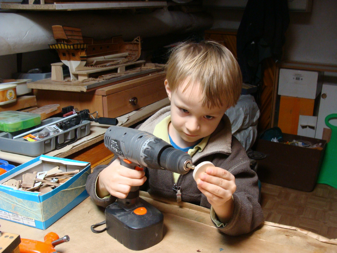 Prace pokładowe.Pachołki wind rei grotmasztu i fokmasztu będą schowane pod pokładem.Ciężko byłoby przewlec linę.Dlatego w tej fazie są na kołeczku.Potem z olinowaniem się je wciśnie na klej w nawiercone otworki.Pozdrawiam.K.
