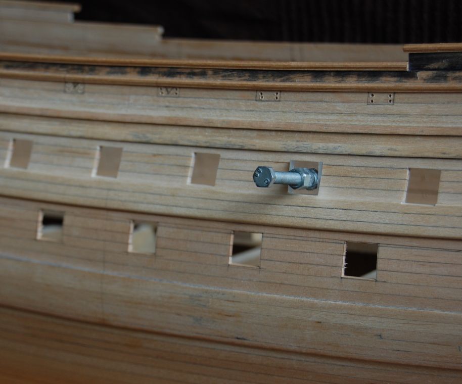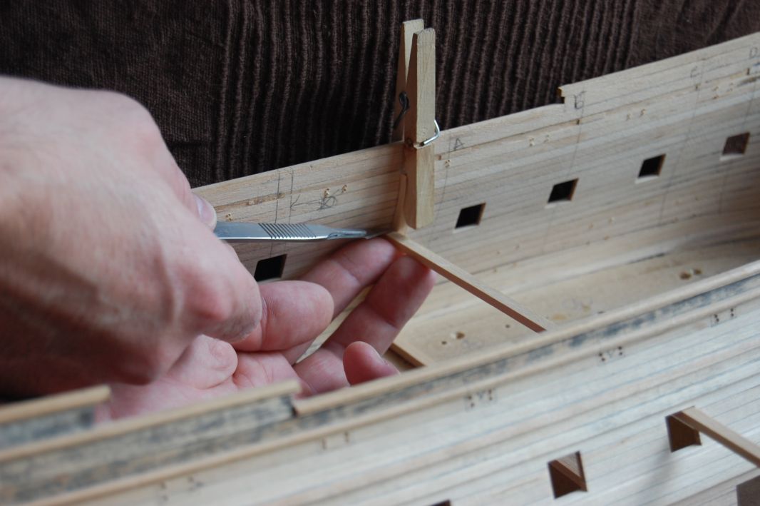Po zgrubnym wycięciu ambrazur podcinam je skalpelem prawie do linii i dopiero na koniec ostrym tarnikiem przypiłowuję kształt (tarnik długi przechodzi przez ambrazurę na burcie sąsiedniej co pozwala mi chwycić poziomy) . Końcówka to już pilniczek do paznokci i sprawdzian żeby nie przepiłować (na szczęście część sprawdzianów pasuje z Vasy bo ich wypiłowanie jest chyba gorsze niż samo robienie ambrazur).