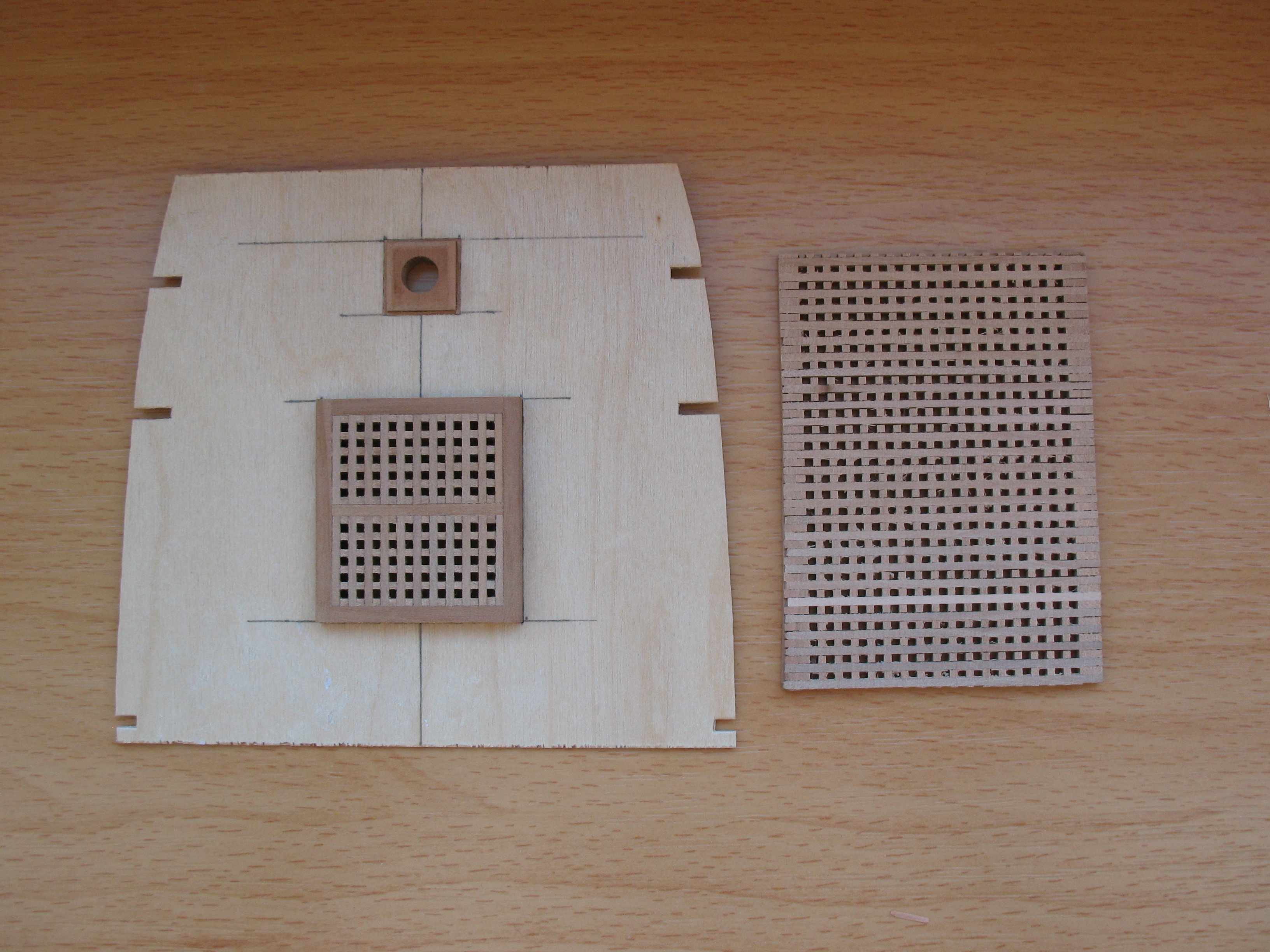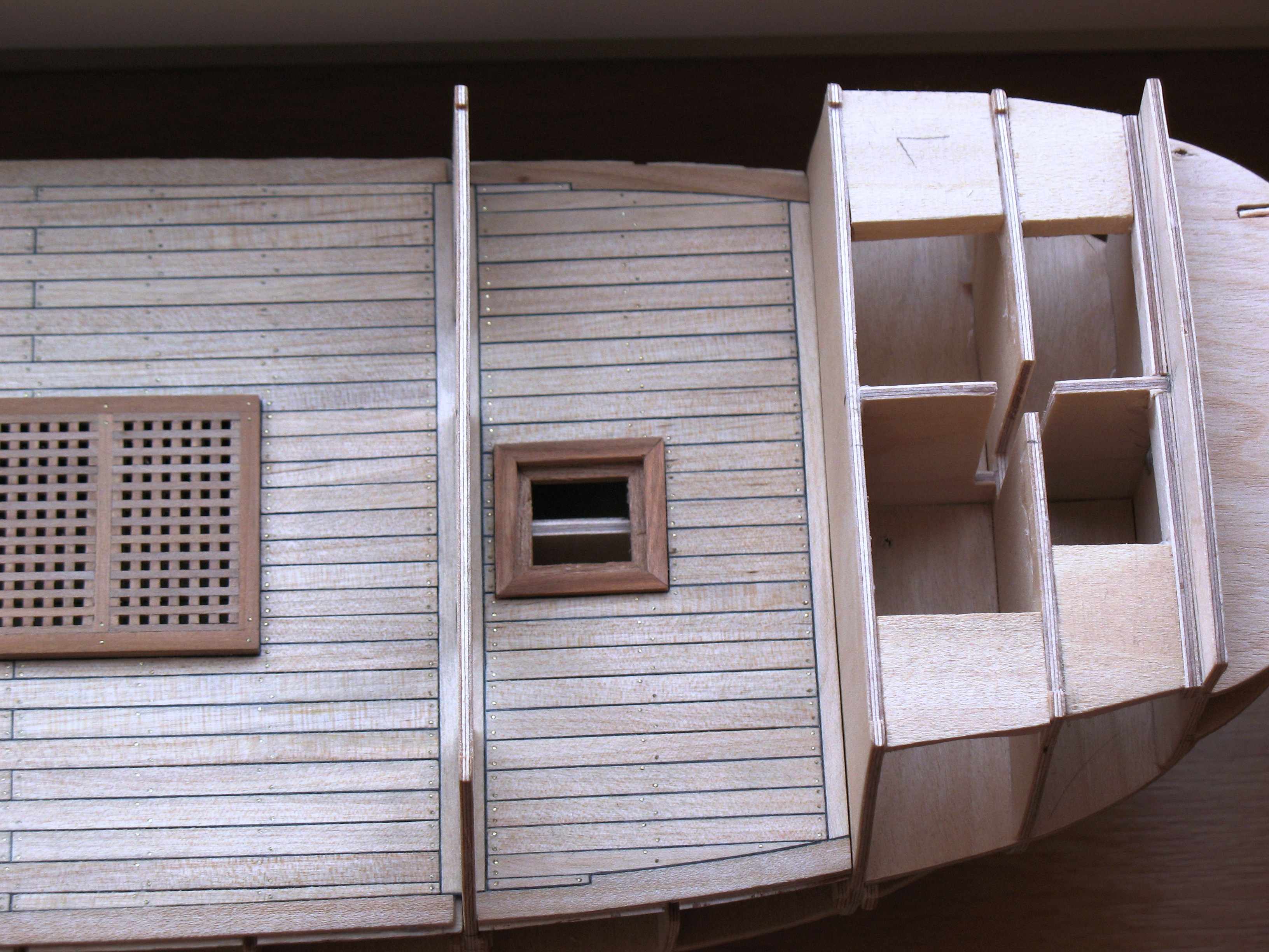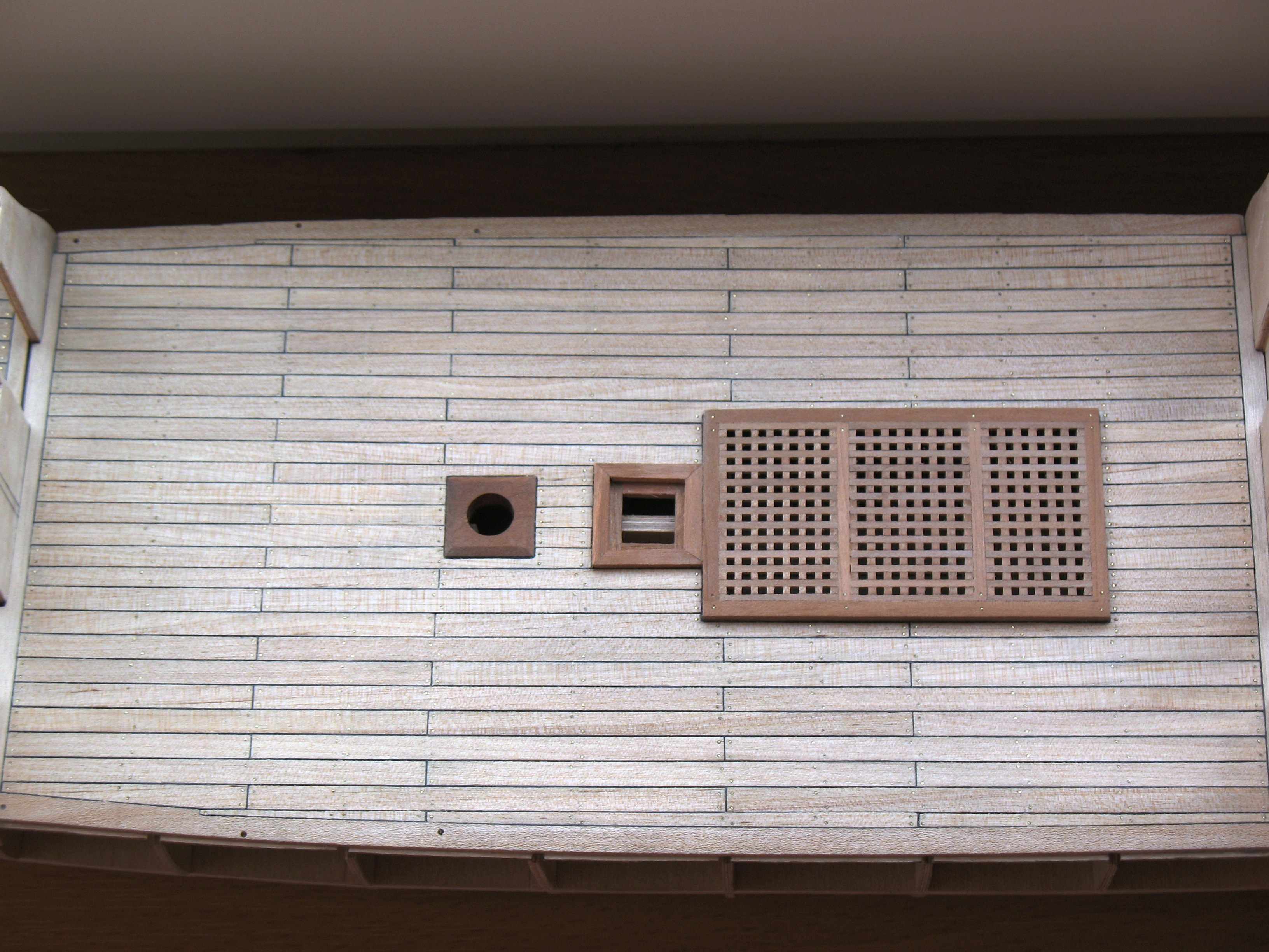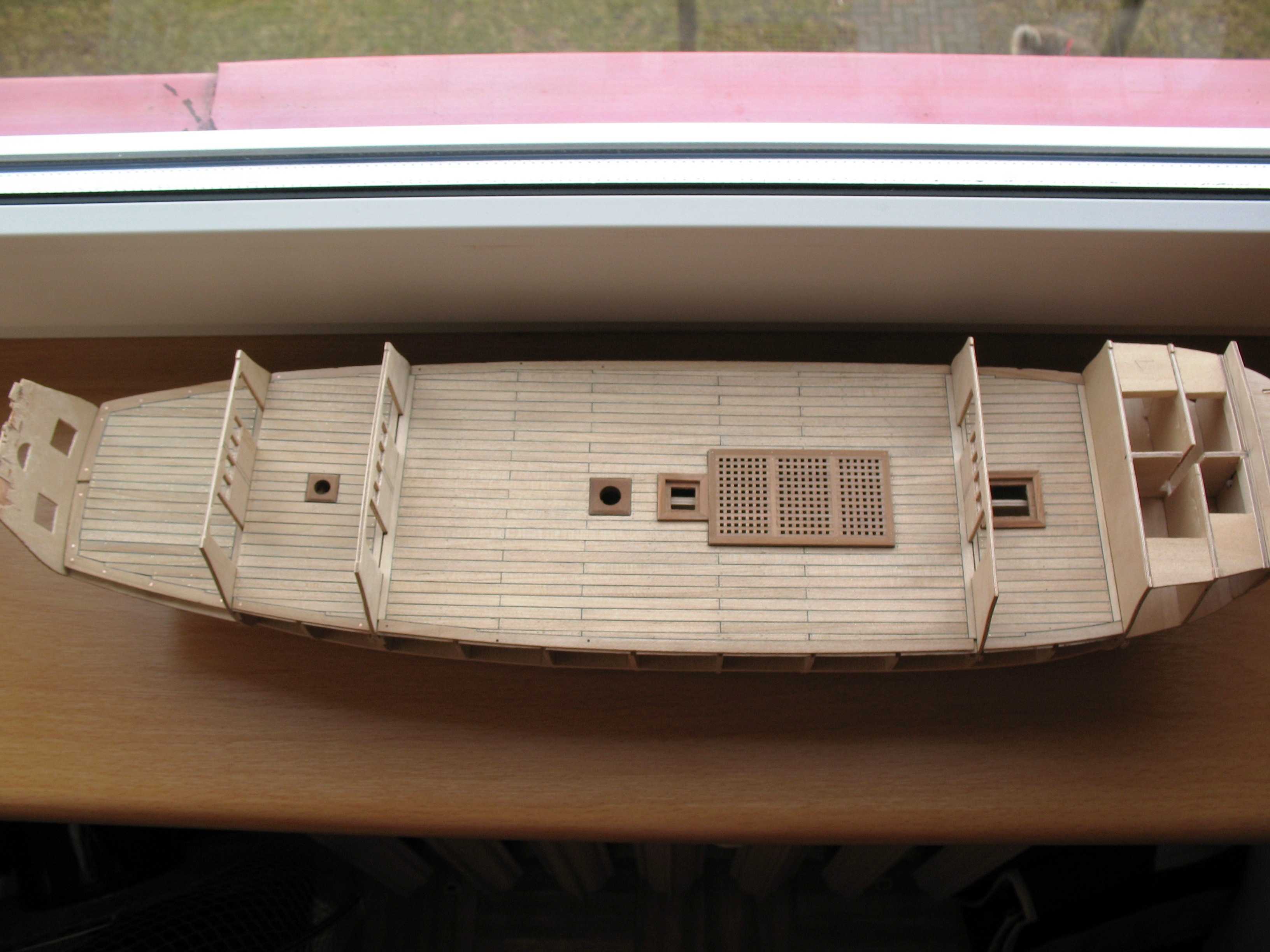 Pokład wykonany z listewek brzozowych (od Pana Mirka), greting z gruszy (od Pana Mirka), waterwaye z gruszy (od Pana Mirka). Kołkowanie pokładu - drut mosiężny 0,5mm za radą Mateusza (Mati). Caulking - 1mm paski czarnego brystolu.