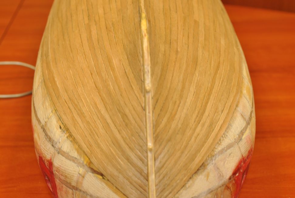 Pobawiłem się trochę w przyklejanie drugiego poszycia części podwodnej. Zamieniłem fornir z mahoniu na czereśnię amerykańską. Z tą czerśnią jest trochę kłopotu, ponieważ trzeba wyszukiwać miejsc bez słojów pomiędzy słojami. Środek jest cały w kółka i nic się z tego nie da zrobić. Jednak efekt po oleju lub pokoście jest zadawalający. Jest to stan surowy. Fornir ma 0,6 mm i dlatego szlifowanie będzie ostatnim etapem wykończeniowym kadłuba.