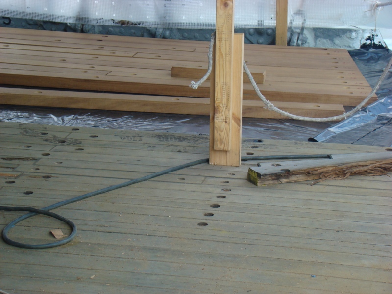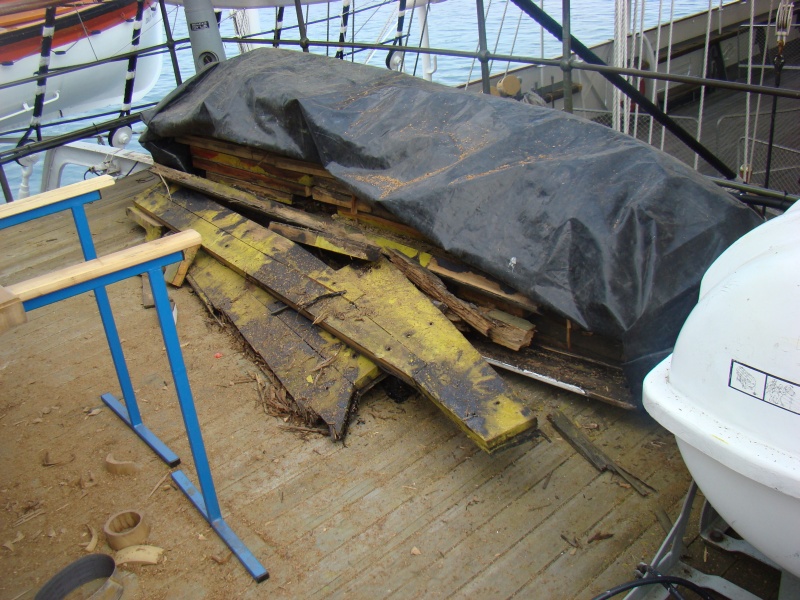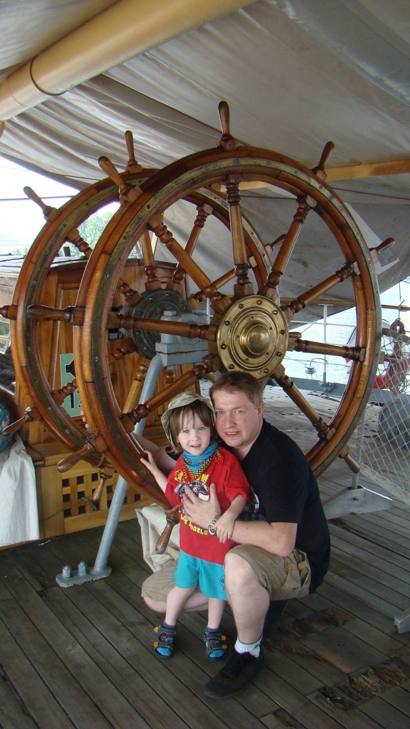 Wybrałem się dzisiaj z rodzinką na Dar Pomorza, aby pomacać prawdziwe koło sterowe ( fotka) a przy okazji przyglądałem się wymianie planek starego pokładu na nowe. Fajna robota ale nie pozwolili mi pomagać