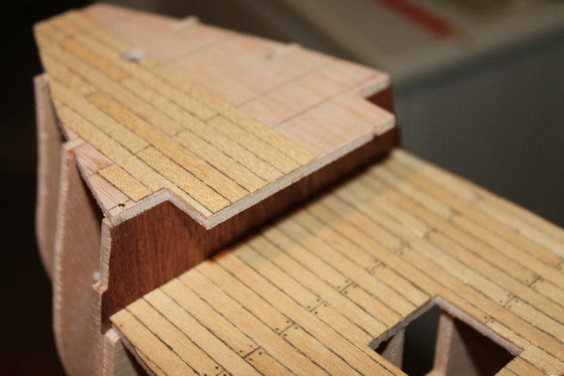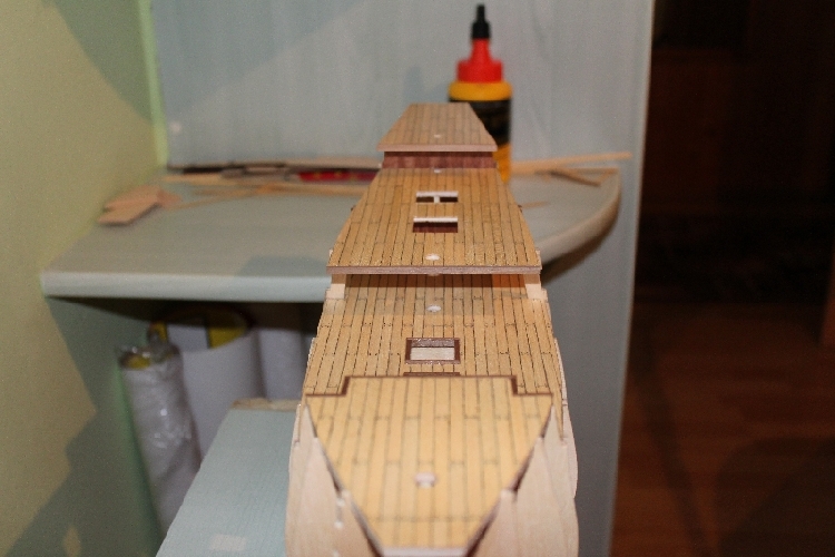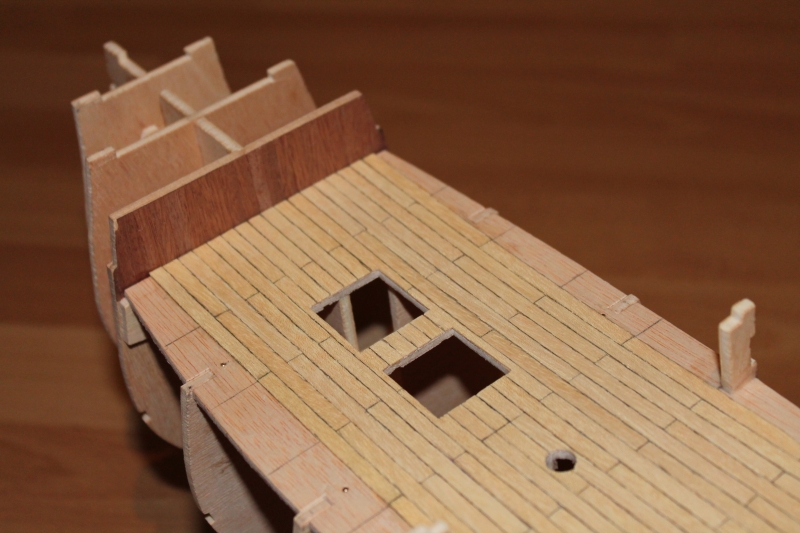 Poza tym pokład środkowy już "zadeskowany" - listewkami z zestawu... Przypomniałem sobie, że posiadam deseczki z kolekcji DeA, więc pokład dziobowy deskuję już tymi normalnymi - zbyt dużo nerwów przy dospasowywaniu desek z zestawu OcCre. Być może to tylko jednostkowy przypadek, sam nie wiem... Środkowy pokład polakierowałem szybkoschnącym lakierem Altax.