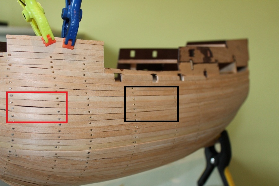 Na czerwono zaznaczone masz miejsce gdzie planki powinny być już zwężane <br />na czarno w tym miejscu nawet początkujący modelarz położy poszycie bez szpar bo jest tam poszycie prawie w lini prostej
