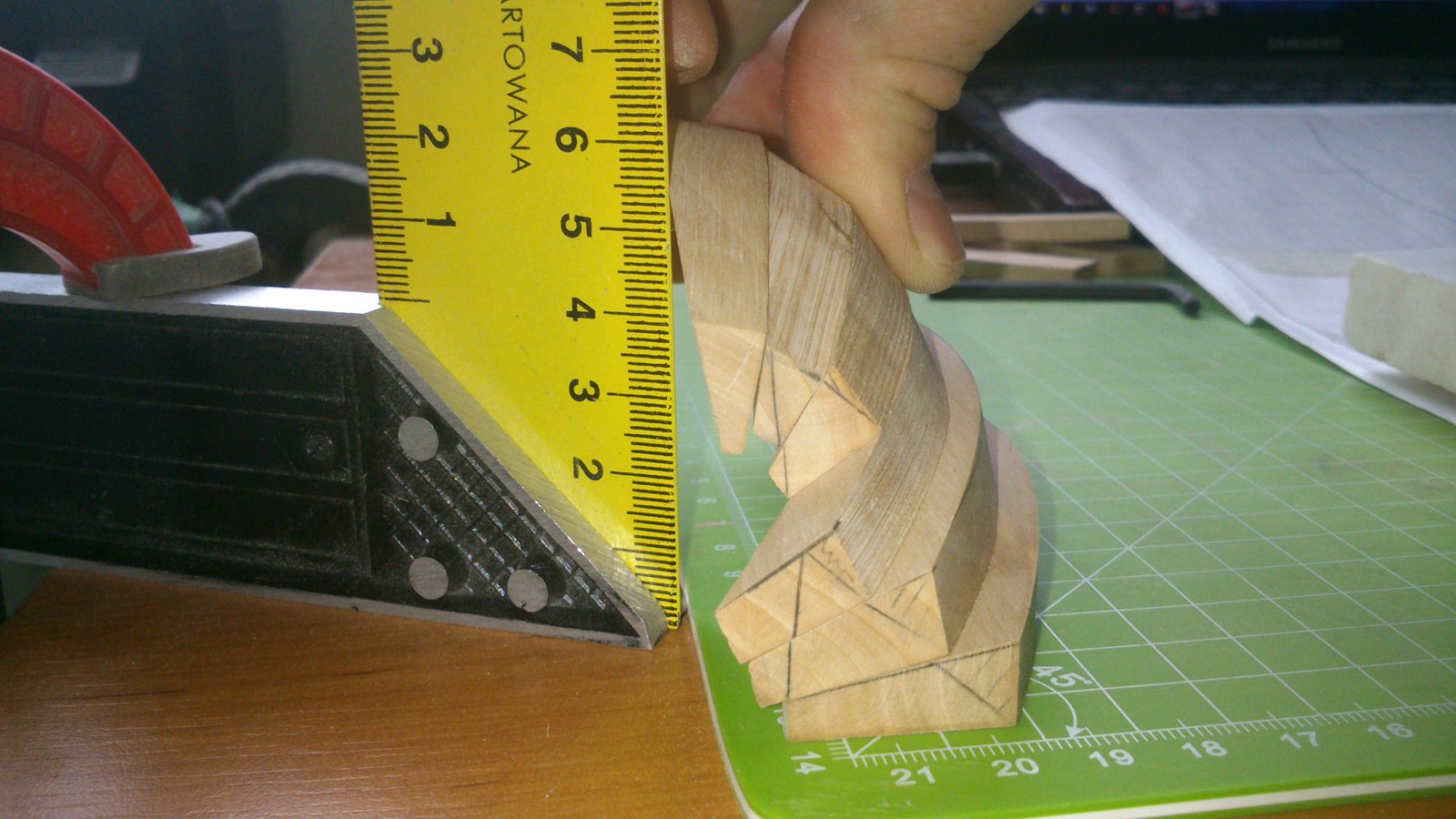 Wykonanie dzióbka metodą wykreślną jest bardzo trudne.Też miałem z tym problem.Zrób go w/g szablonu, metodą dopasowywania krawędzi.Naddatki zewnętrzne i wewnątrz zbierzesz łatwo szlifierką lub klockiem z papierem ściernym.Ewentualne niedokładności zatrzesz na klej, podczas szlifowania.Może te zdjęcia z mojej roboty Ci pomogą.Przepraszam,że nieco zaśmiecę.Pozdrawiam.Kazimierz