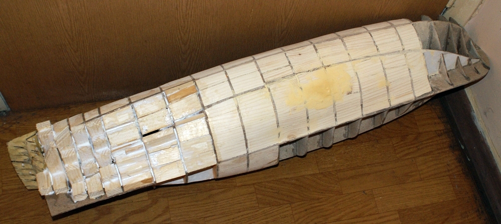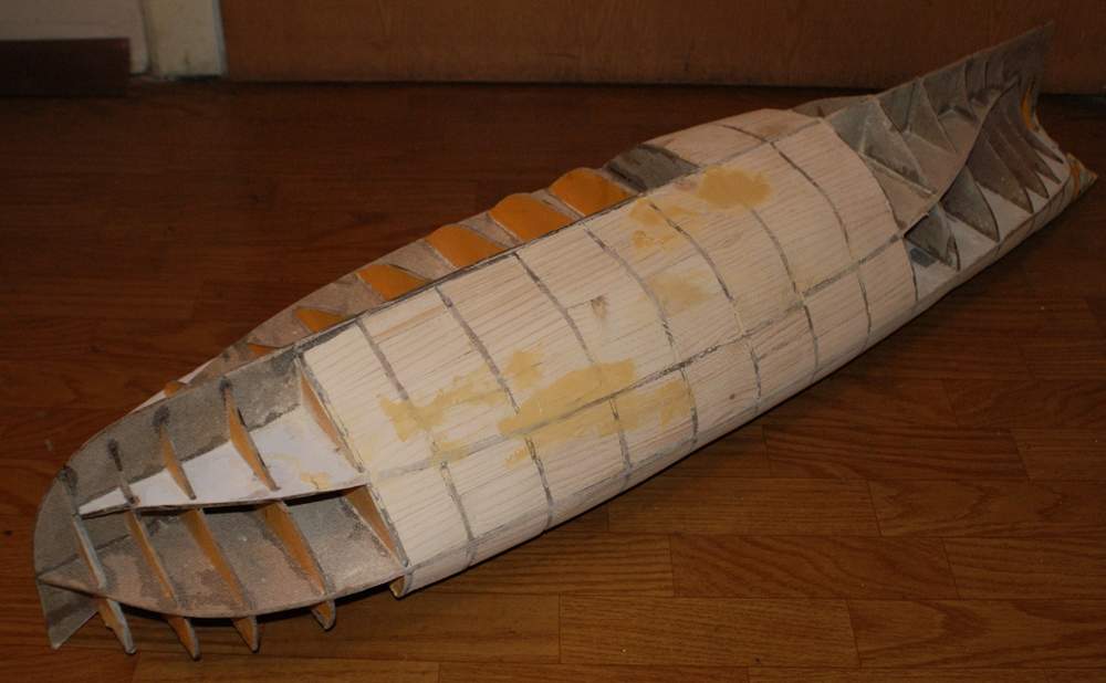 Kadłub jest tak sztywny, (dzięki wstawionym wodnicom) że nie zachodzi potrzeba naprzemiennego wypełniania. Rufa jest dość trudna i wolałem mieć "oko na wręgi bez wypełnienia.