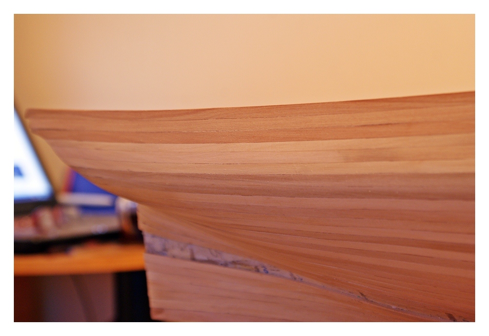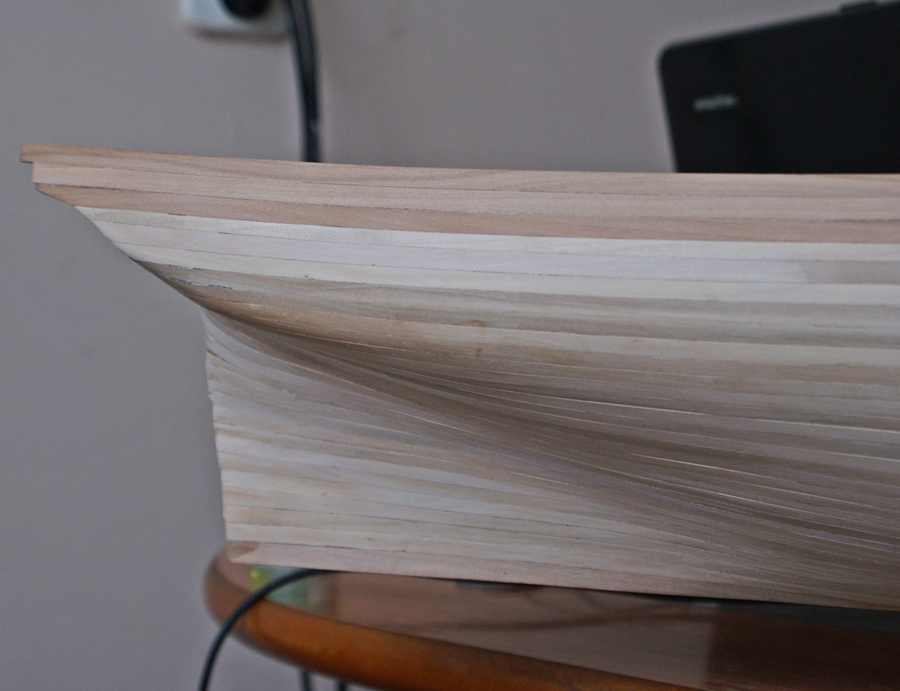 W najszerszym miejscu kadłuba pozostało 72 mm kadłuba do poszycia. Planki mają 6 mm szerokości, pozostało 12 planek - 72/12 = 6 mm.