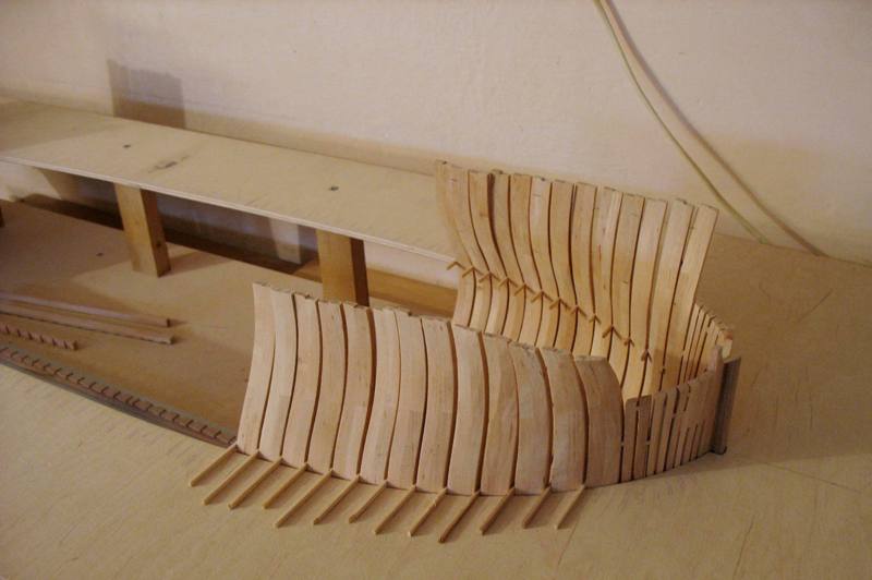 Minął czas lenistwa więc zrobiłem 392 elementy z których powstało 28 wręg . Sklejałem na planach co by być pewnym prawidłowego ułożenia . Zebrała się niezła gromadka teraz trzeba to oszlifować .