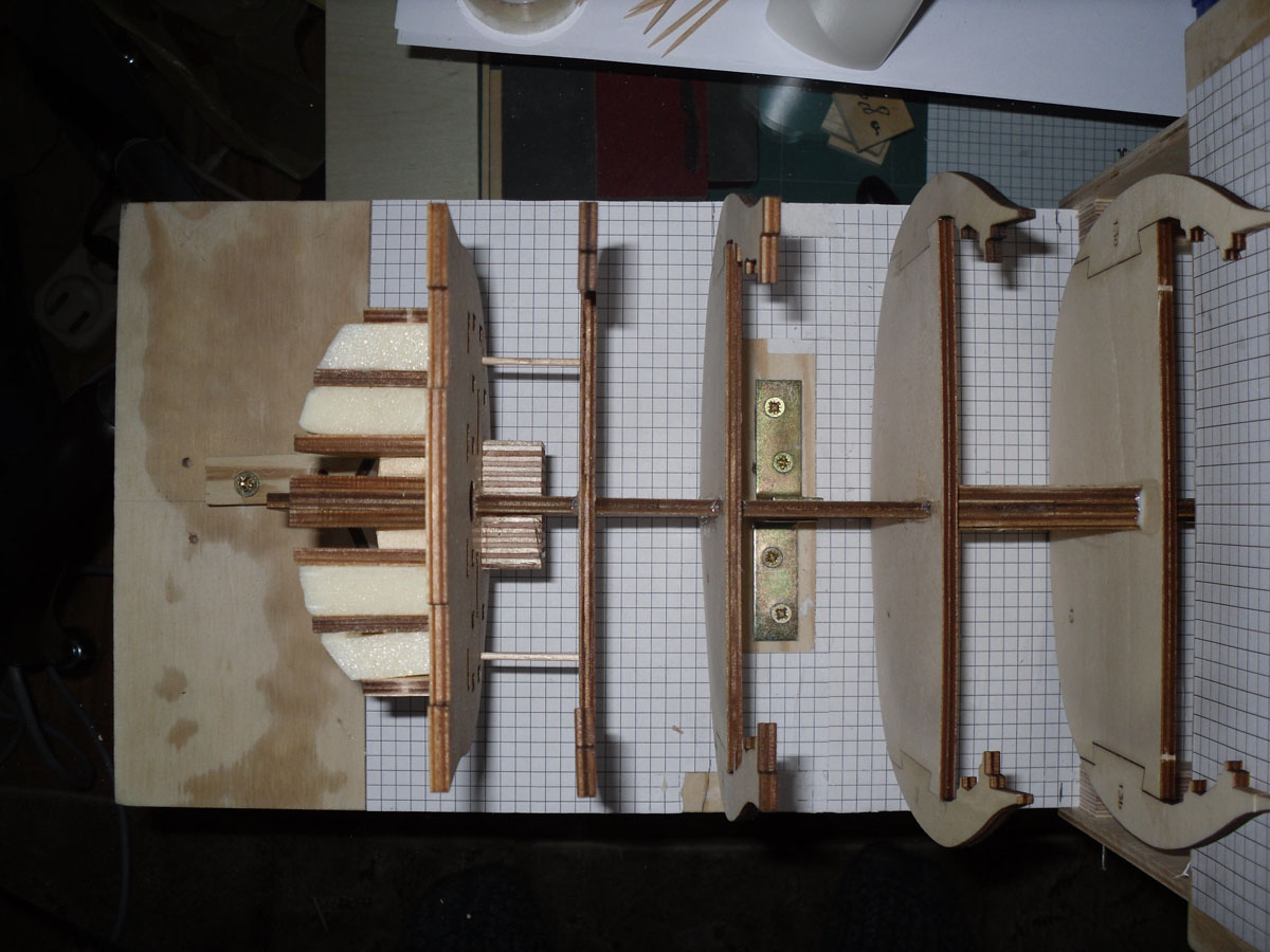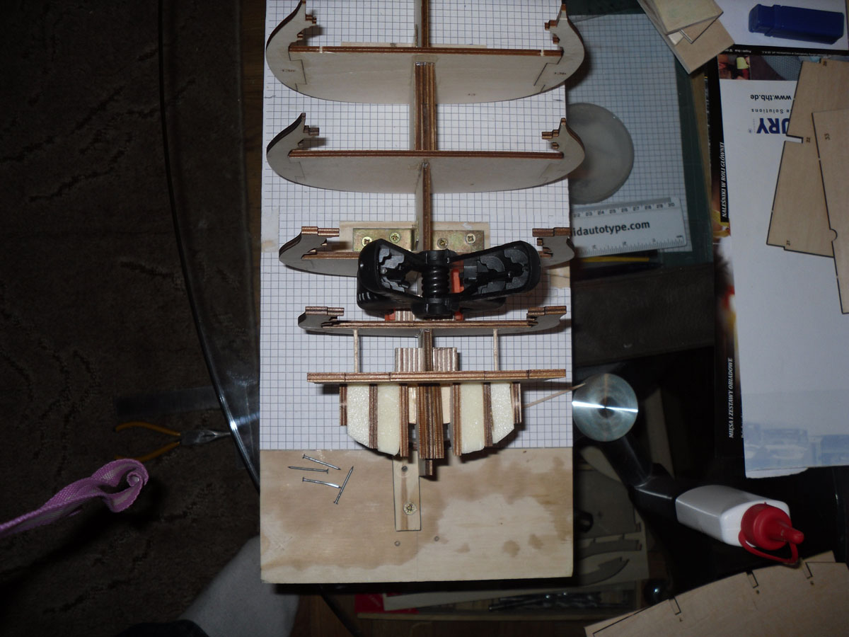 Zmontowałem stępkę na prowizorycznej stoczni, którą widać na zdjęciu dodanym poniżej. Wręgi okrętu prostowałem, ale cieszy mnie tylko fakt, że nie było zbyt wiele elementów do prostowania, następnie wszytko skleiłem. Teraz jestem na etapie montowania stoczni z planów, które znalazłem. Po jej zmontowaniu zabieram się za łączenie stępki z wręgami. A oto kilka zdjęć z montażu stepki.