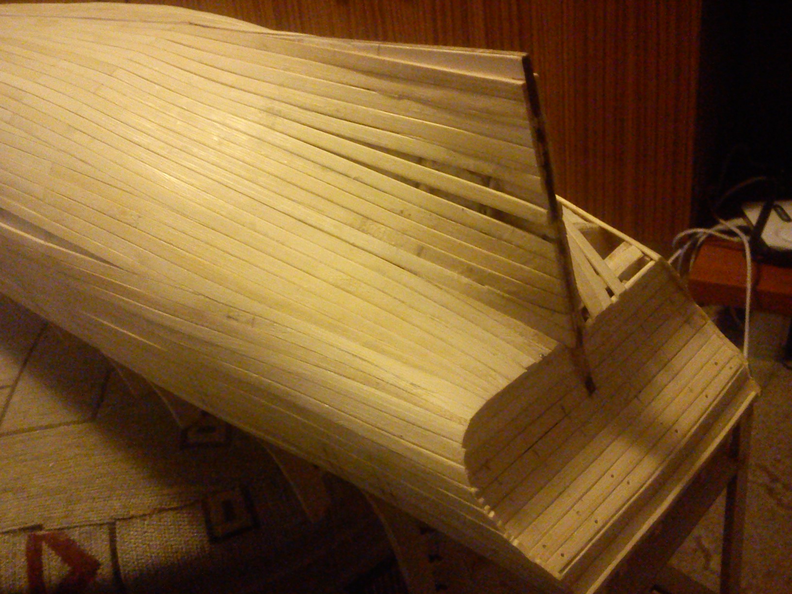 Zakończyłem częściowo prace nad pierwszym poszyciem z bambusa do wysokości środkowego pokładu. Skorzystałem z rady kolegi PawelCH rezygnując z kleju cyjanoakrylowego i zastąpiłem go klejem stolarskim D3 expres .