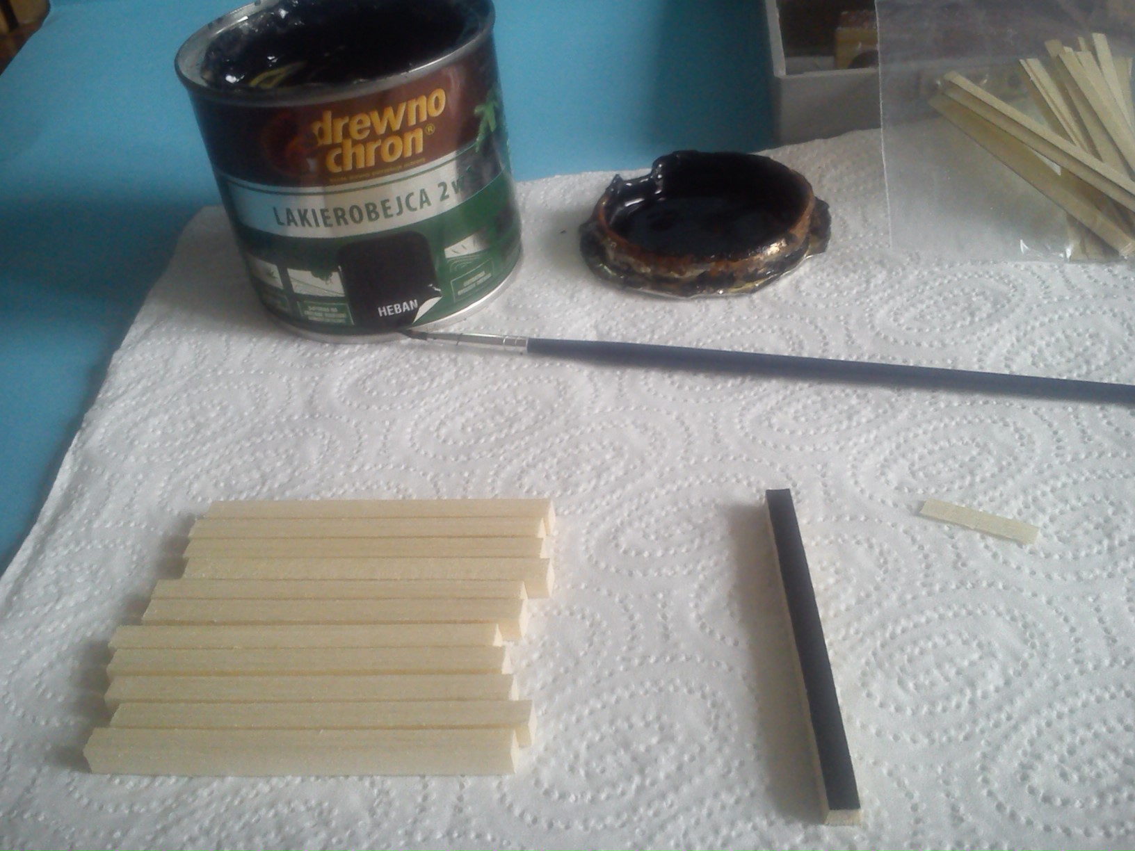 Przygotowałem kilka pakietów deseczek na pokład . Krawędz jedną długa i jedna krótką pokrylem klejem a następnie pomalowałem lakierobejcą heban .