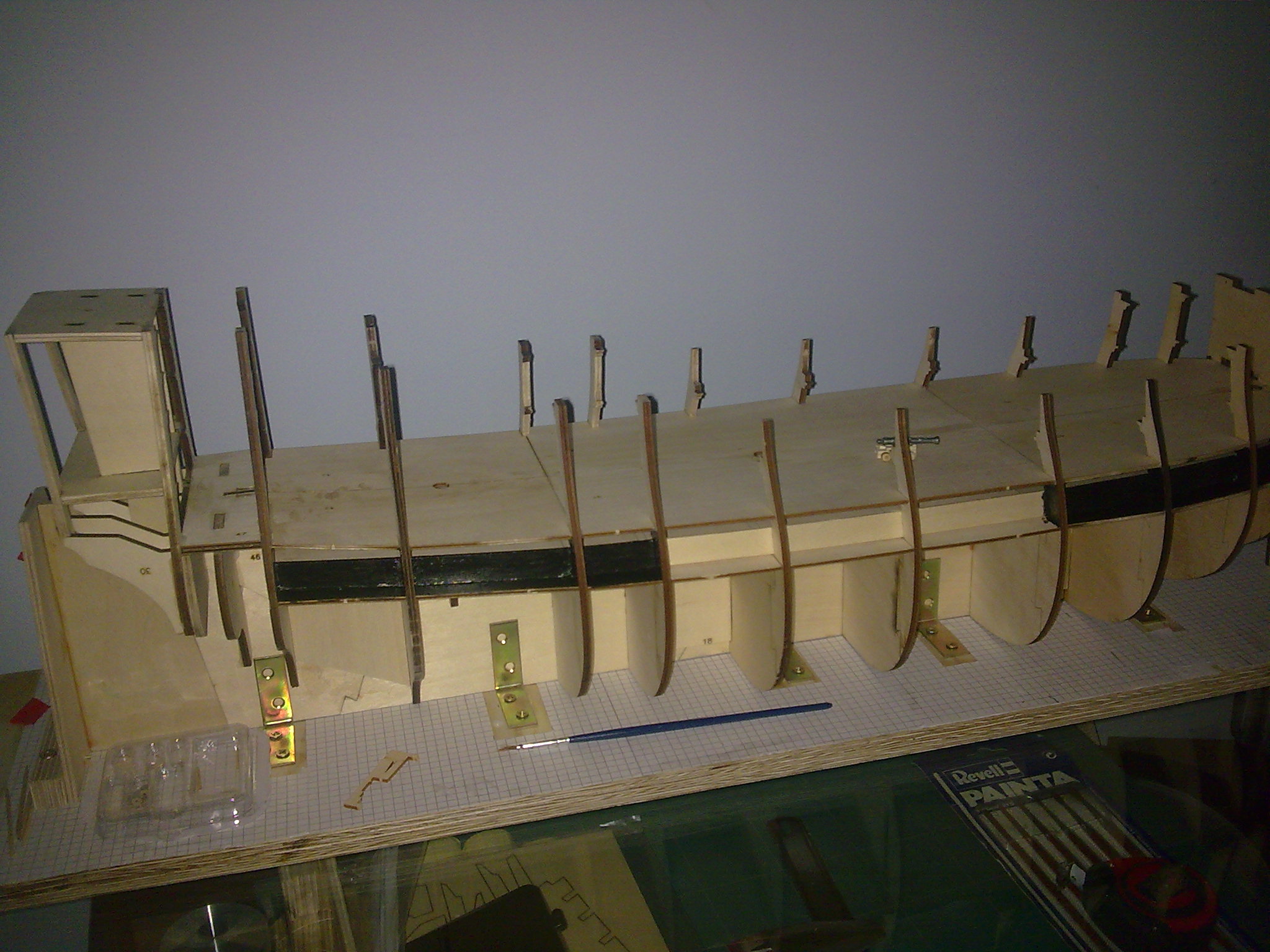 Kolejny etap to montaż wzdłużników miedzy pokladem 1 a pokładem 2 oraz pokładniki . Dolny poklad nr1 bedzie niewidoczny przez luki działowe . Zamontwane zostaną tam atrapy dział. Wkleiłem też szkielet galeryjki rufowej.