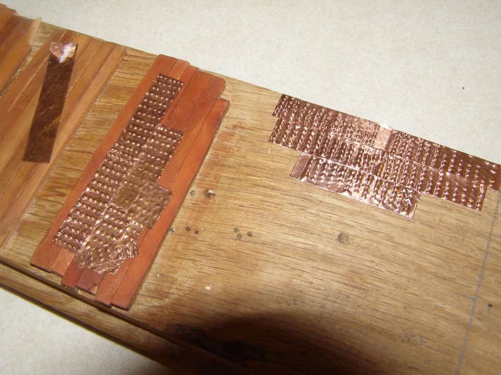 Do miedziowania kupiłem folie miedzianą, w sklepie z akcesoriami witrażowymi. Pasek miedziany szerokości 8mm, dokładnie taki jak potrzebowałem, grubości 0.025mm. Z tego co widzę robią tez grubsze i jak bym miał to robić drugi raz to kupiłbym 0.038mm. Moze byłaby mniej delikatna i lepiej by się wytłaczało gwoździowanie.