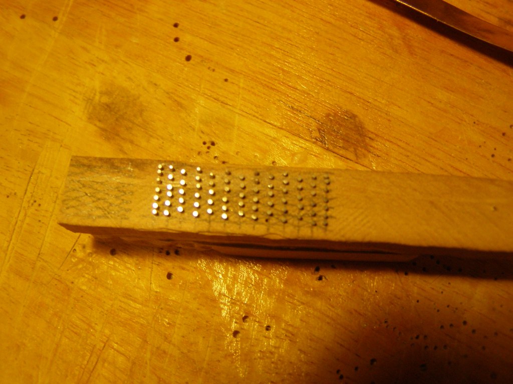 Wzornik do wytłaczania zrobiłem ze szpilek 20x0.7mm osadzonych w drewienku. Jako, że człowiek najlepiej uczy się na błędach, a jeszcze lepiej uczyć się na cudzych, to na początek kilka takowych