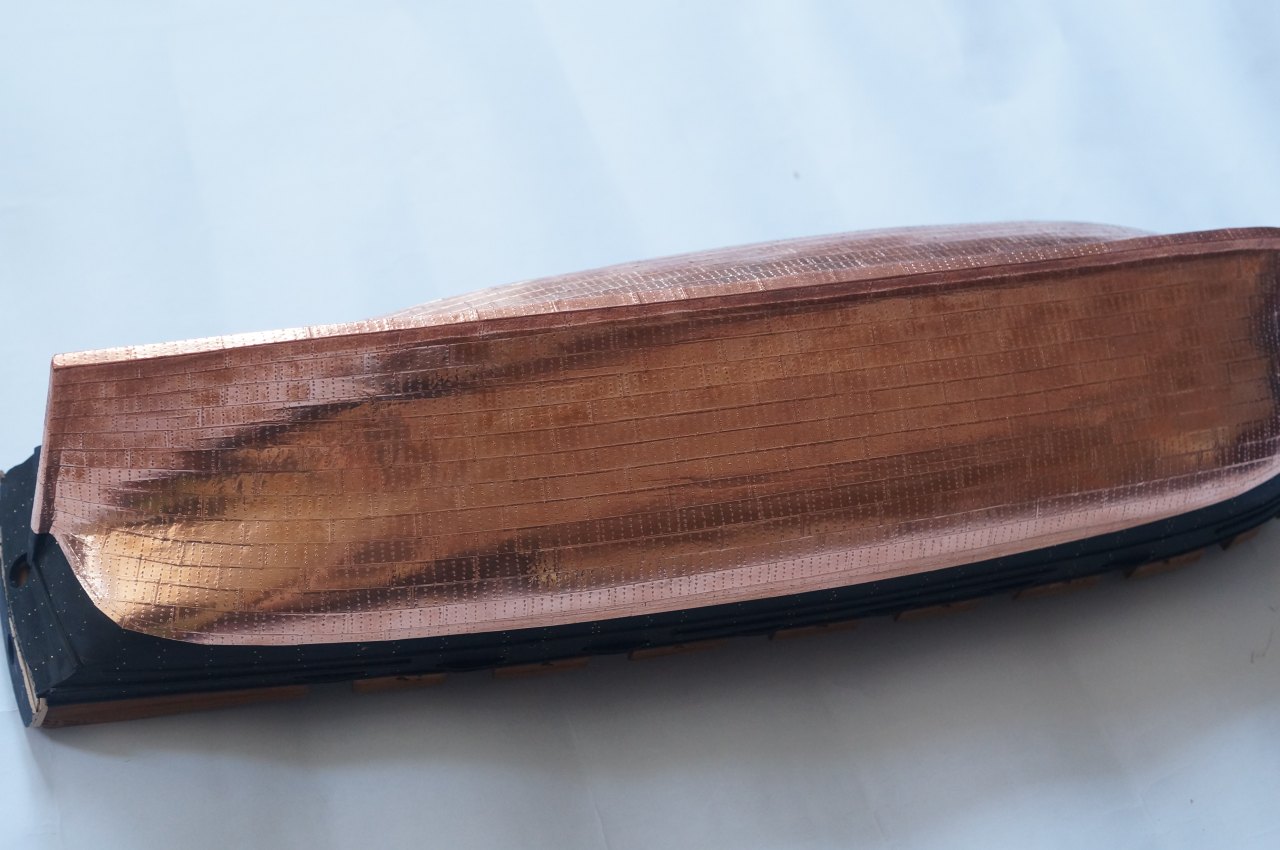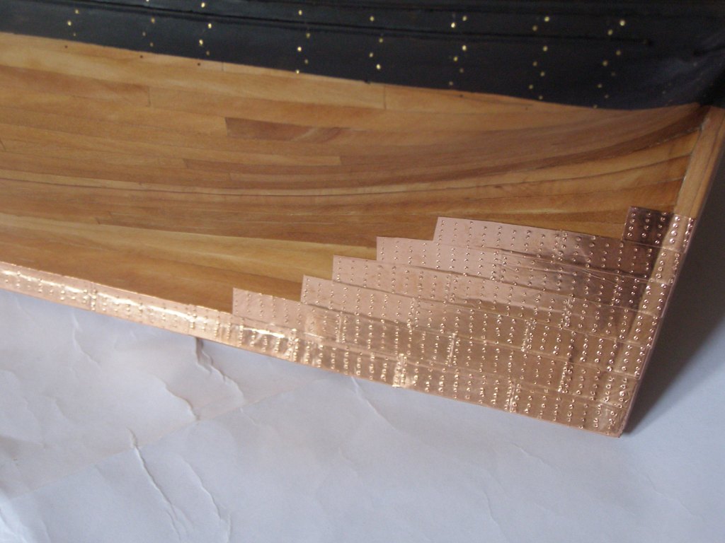 Miedziowanie. Pomimo, że właśnie takie rozwiązanie jest przedstawione w planach początkowo planowałem zostawić poszycie w naturalnym drewnie. Po przejrzeniu relacji Borka i jego Bellony zmieniłem zdanie.